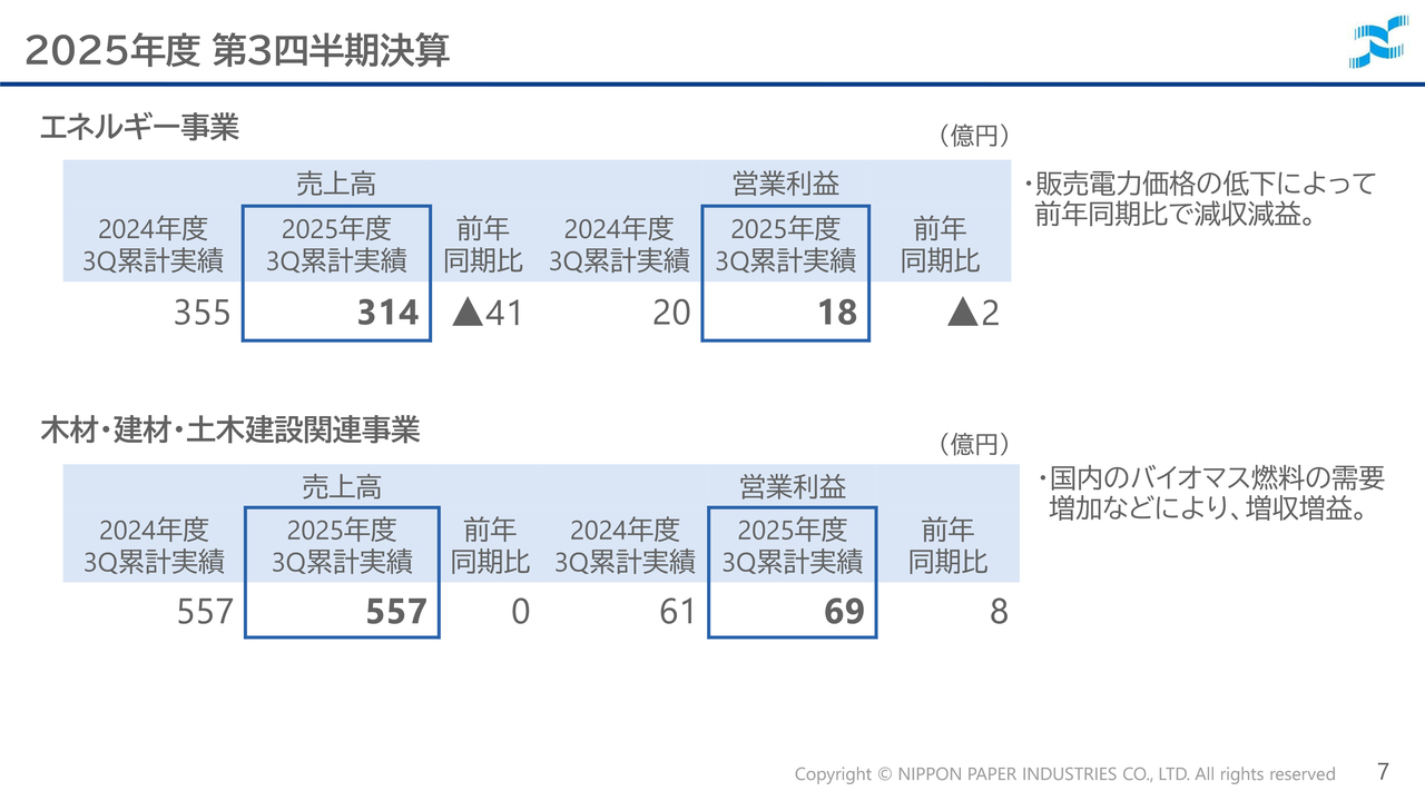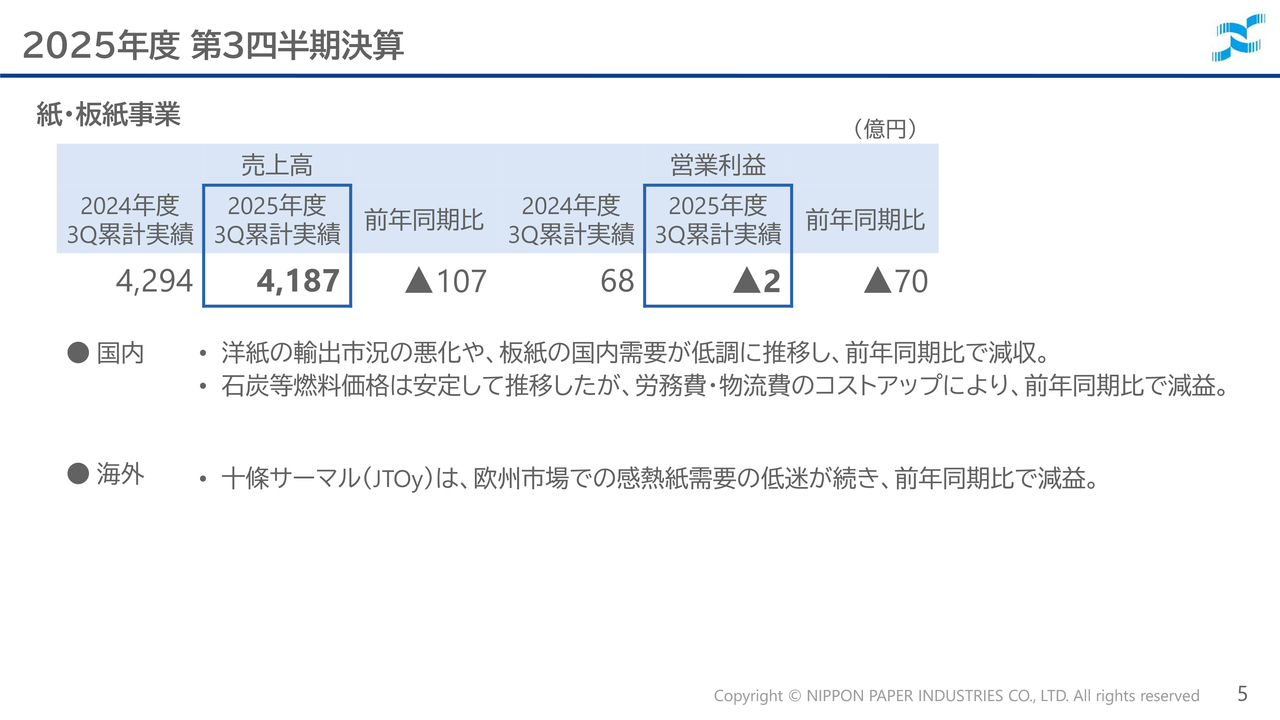 なお、紙・板紙事業においては、第3四半期累計で2億円の営業損失を計上しましたが、第3四半期単独では営業黒字に転じています。
