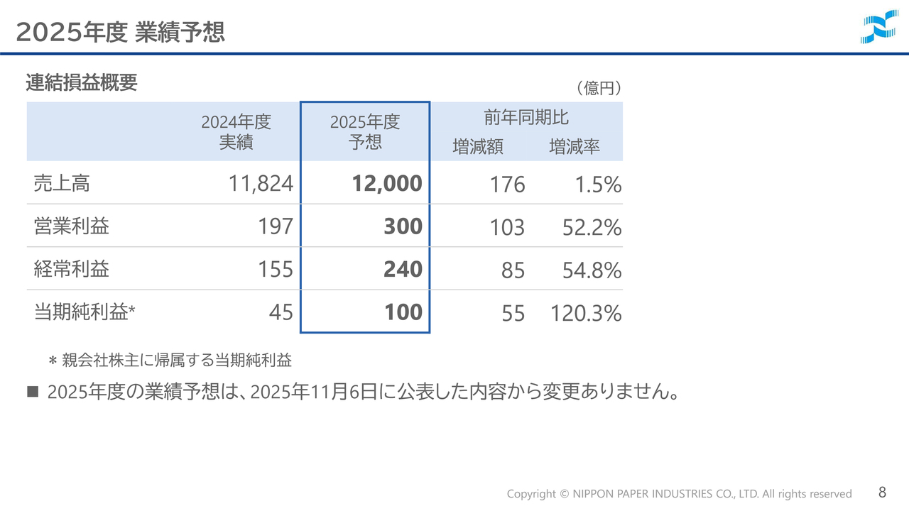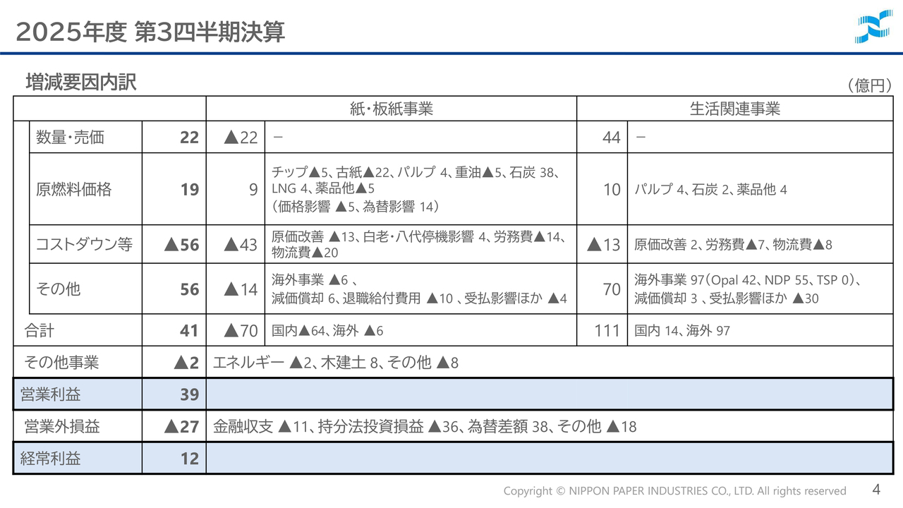特別損益については、2024年12月に発生した日本製紙八代工場のボイラートラブルに伴う復旧費用や、Opalの労働争議による操業停止損失を計上しましたが、政策保有株式の売却に伴う有価証券売却益や退職給付信託返還益を計上しました。この結果、経常利益は140億円、当期純利益は78億円となっています。