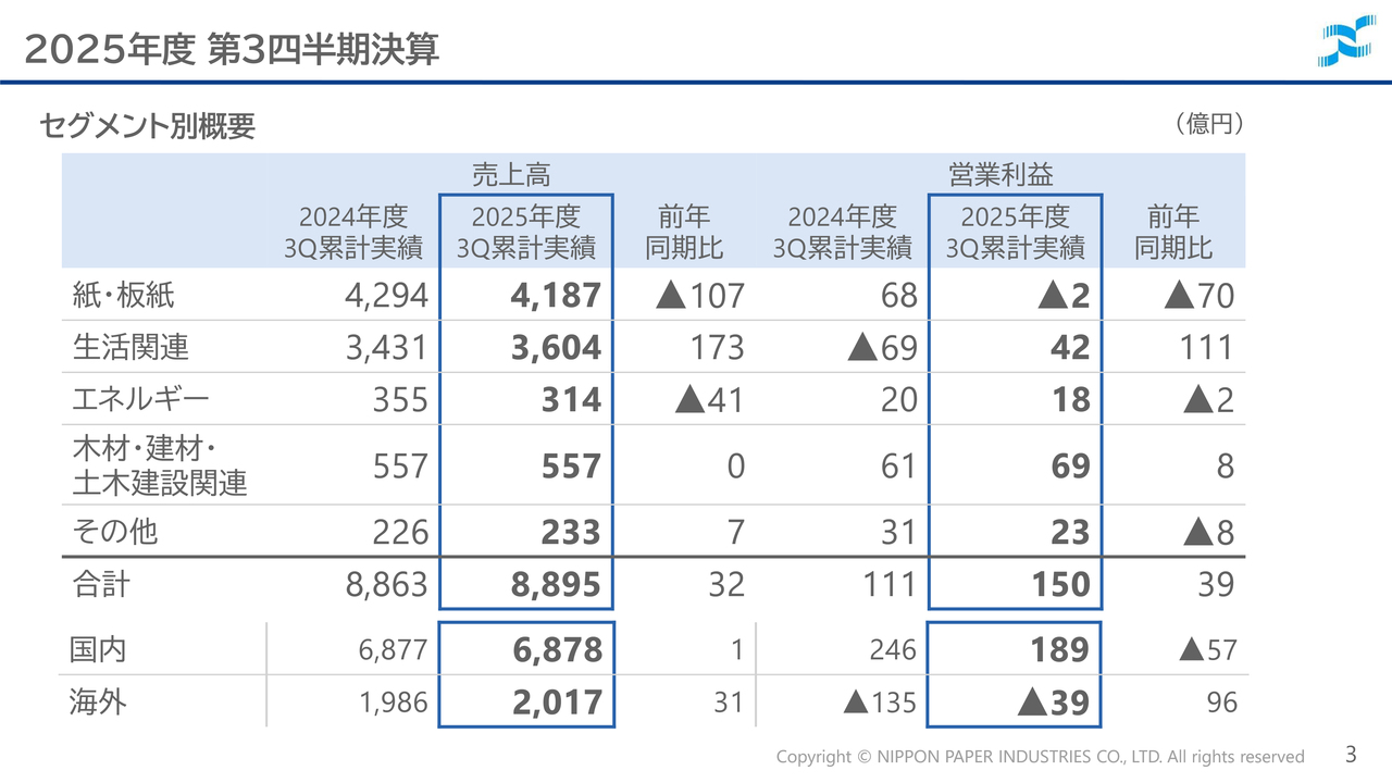 的場宏充氏:日本製紙株式会社管理本部長の的場です。本日はよろしくお願いします。2025年度第3四半期の決算概要についてご説明します。