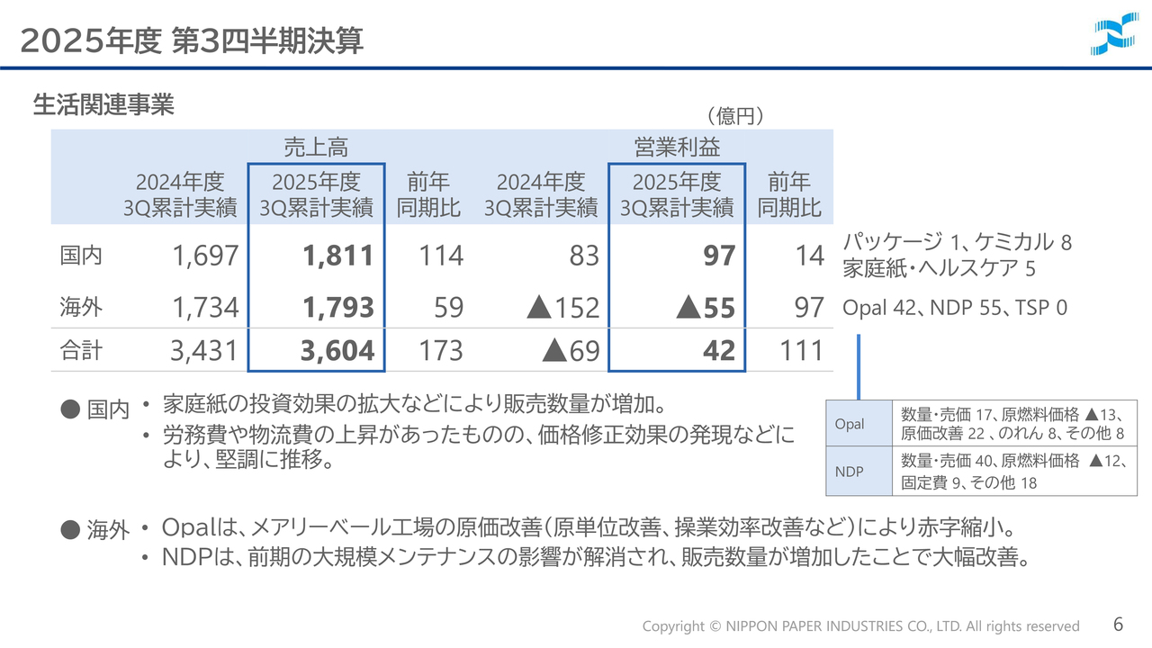 生活関連事業は前年同期比111億円の増益となりました。国内事業は、パッケージにおける価格修正効果や、家庭紙・ヘルスケア・ケミカル分野での販売数量増加および価格修正効果により増益となっています。海外事業においてもOpalの収益改善や、前期に大規模メンテナンス休転を実施したNDPが平常操業に戻ったことにより、大幅な改善が見られました。