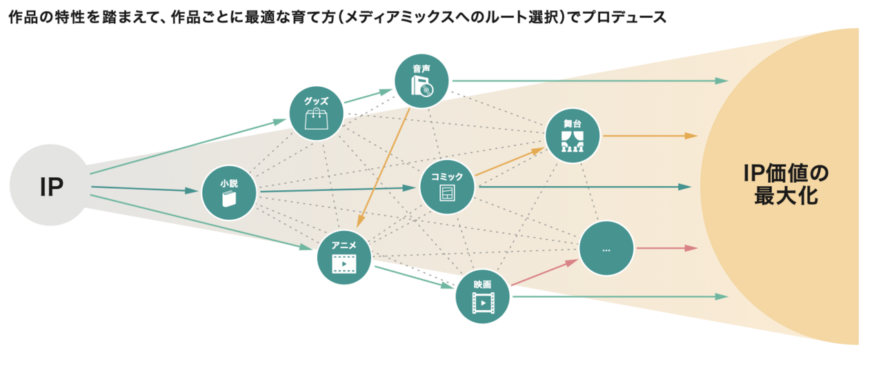 原石のIPを紡いで、出版からプロデュースし、届けるというところにつなげていくわけですが、すべてのIPがアニメ化に適しているわけではありません。必ずしもアニメとしてプロデュースし、認知を広げることが最適解ではなく、違う展開のほうがそのIPには向いていることもあります。
