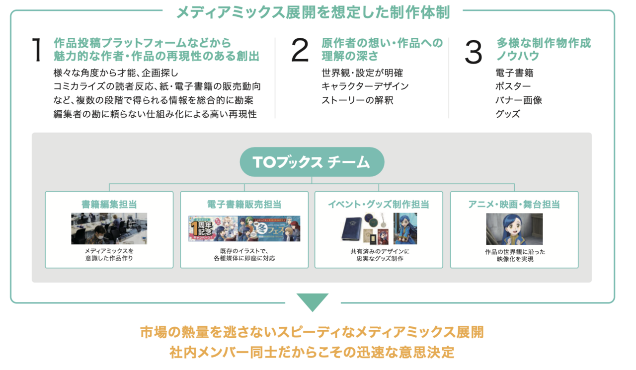 第1に、メディアミックスの深化です。アニメ化においても、深夜帯での放送か、全日帯での放送かなど、マーケティングに基づいた放送タイミングを検討し、データや知見を活かしてプロデュース機能をさらに進化させていきます。