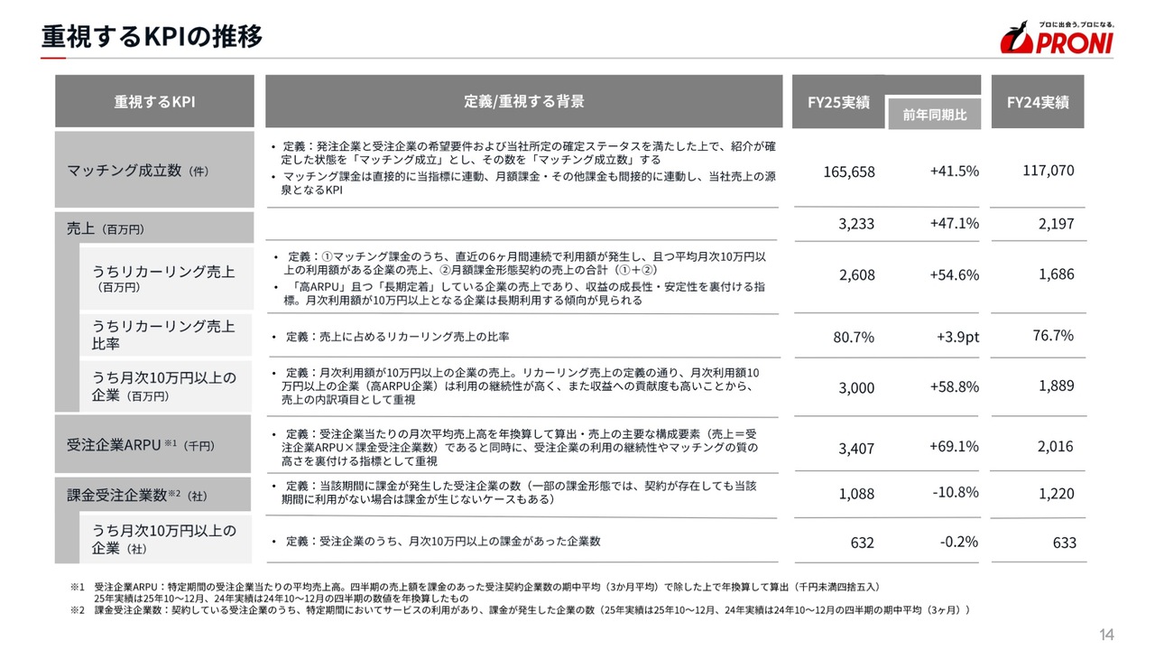 重視するKPIの推移です。スライドには、マッチング成立数、売上およびリカーリング売上の割合、受注企業ARPU、課金受注企業数などを掲載しています。お時間がある際にご覧いただければと思います。