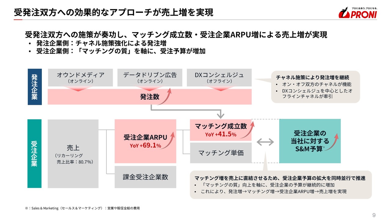 マッチング成立数の増加に直結させるために、「マッチングの質」に重点を置いた取り組みを行いました。その結果、受注企業から「PRONIにS&M費用をさらに預けてもいい」との成果が得られ、2025年12月期の受注企業ARPUは年間69.1パーセント伸ばすことができました。