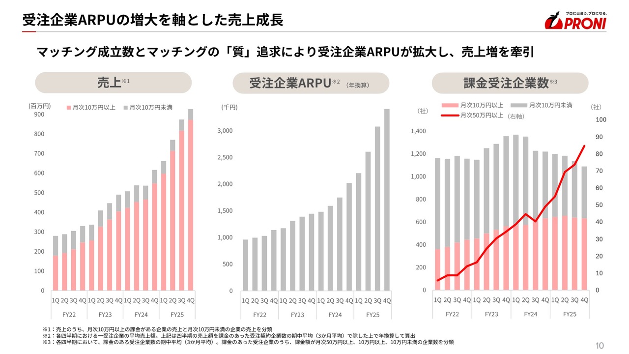 スライドは、売上高、受注企業ARPU、課金受注企業数のグラフです。売上高のグラフに関しては、毎月10万円以上ご利用いただいている企業をピンク色の棒グラフでお示ししています。