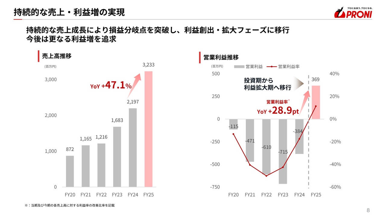スライドのグラフは、売上高と営業利益の推移をお示ししています。売上高は、2023年12月期から順調に伸びています。一方、営業利益については、2023年12月期に最も投資を行いましたが、着実に黒字化のフェーズに入り、損益分岐点を突破したため、現在は利益創出・拡大フェーズに移行しています。