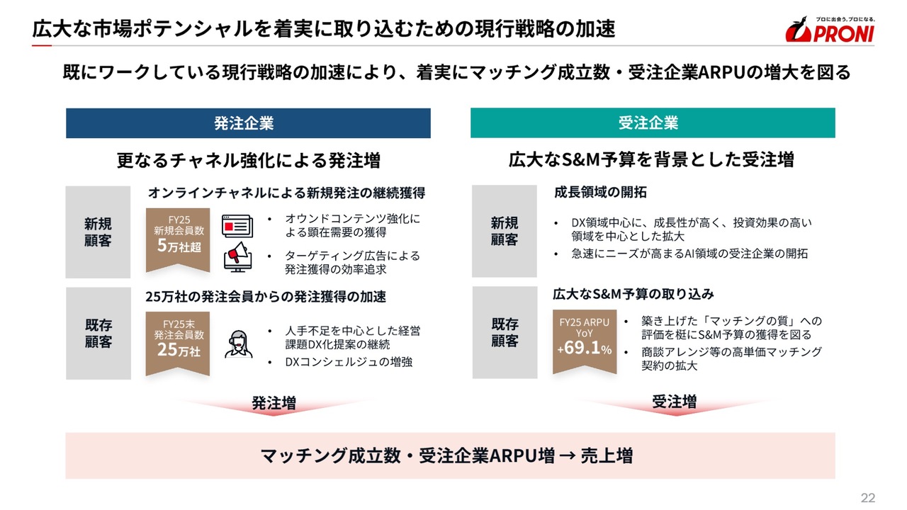 既存顧客については、2025年12月期に受注企業ARPUを前年同期比69.1パーセント引き上げることができました。2026年12月期においても「マッチングの質」を重要視しつつ、S&M費用を預けていただけるような施策を進めていきます。一方、発注企業向けの施策としては、マッチング成立数を増やし、受注企業ARPUを向上させることで、売上の拡大を目指します。