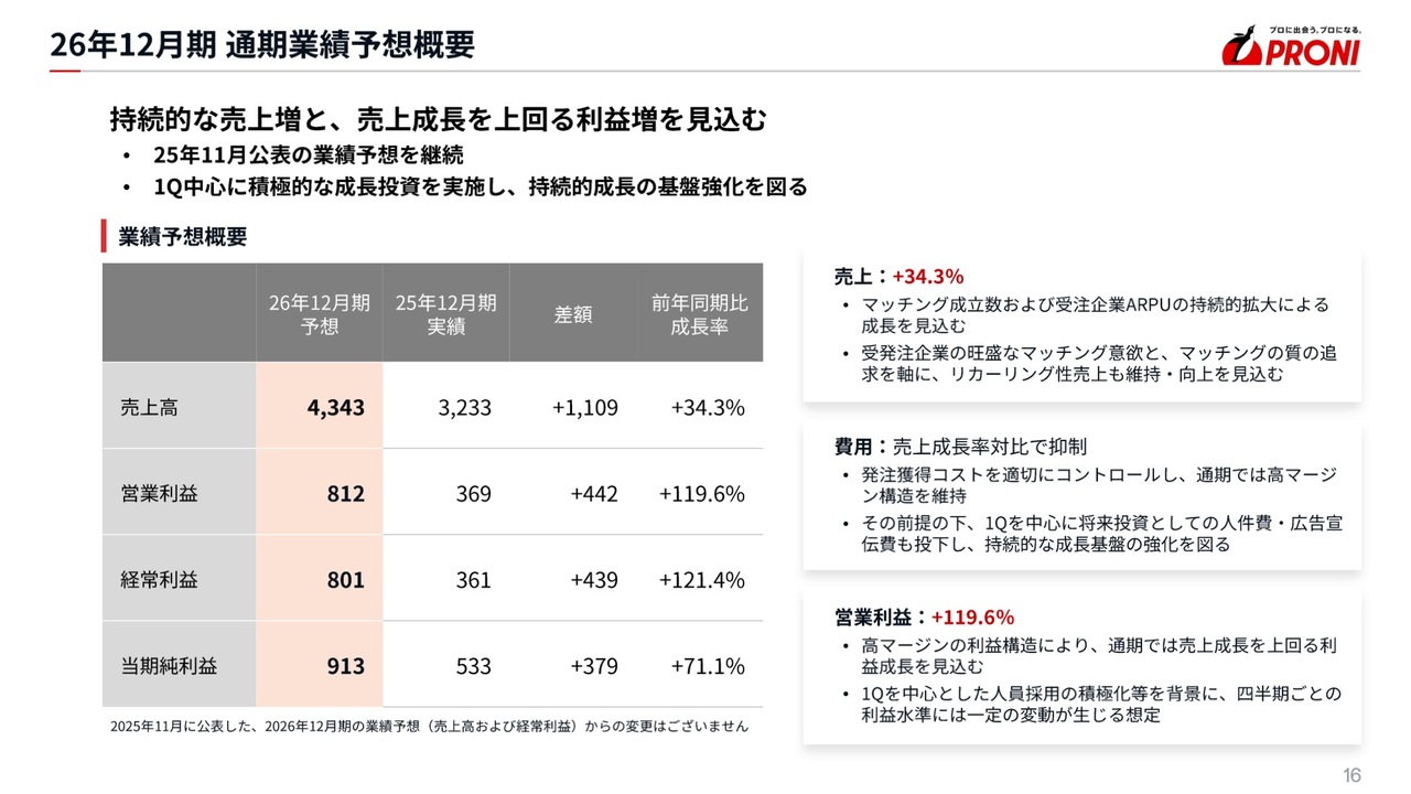 2026年12月期以降については、マッチング成立数をさらに増やし、売上を拡大していきたいと考えています。発注獲得チャネルの一環として外部パートナーの活用を強化するため、外部パートナー向けの外注費の増加を見込んでいます。また、2026年12月期第1四半期は通期の採用計画を前倒しで進める方針のため、一時的に採用費を含むコスト増を見込んでいます。