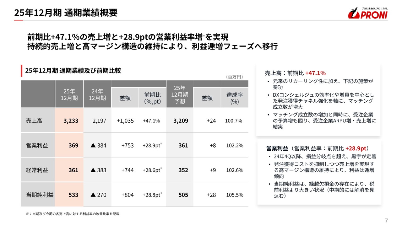 小林亮氏(以下、小林):執行役員経営企画部部長の小林亮です。PRONI株式会社2025年12月期通期決算説明会を開催します。本日はご多忙の中、通期説明会にご参加いただき、誠にありがとうございます。