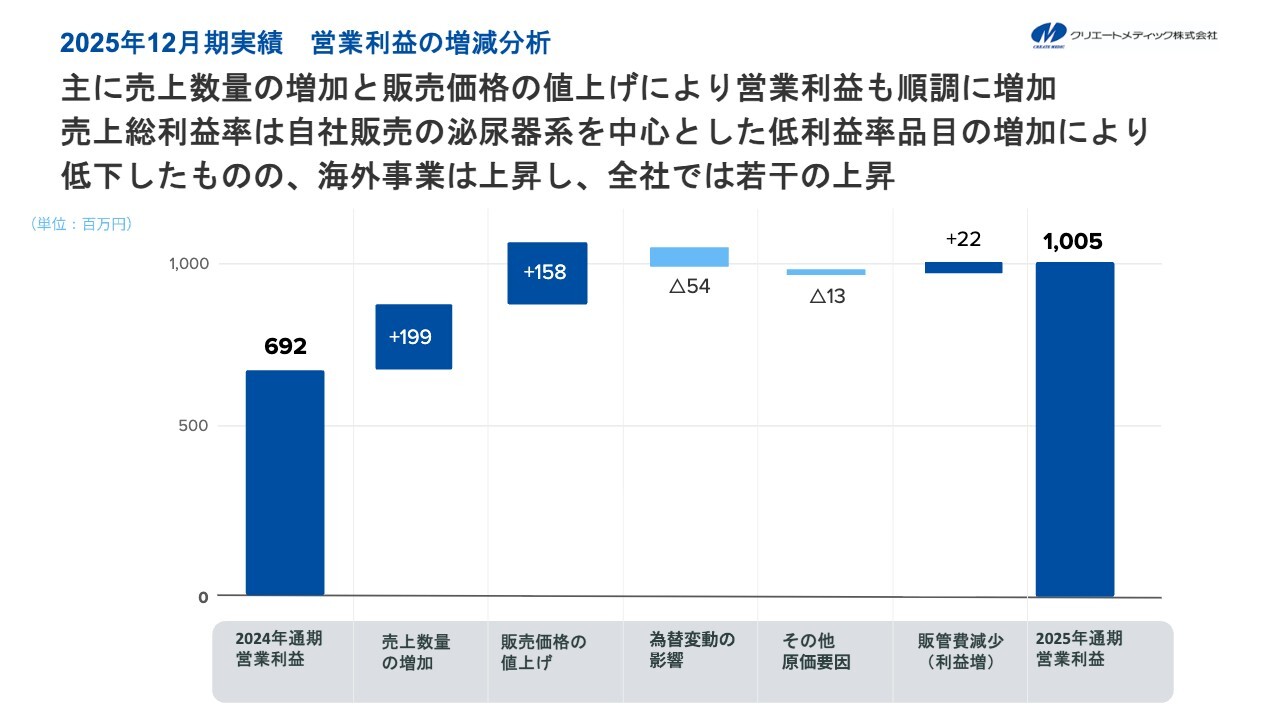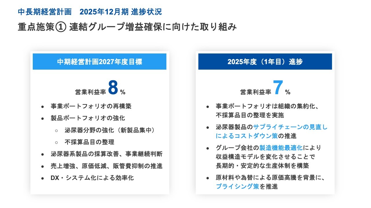 2025年12月期は、事業ポートフォリオの強化や、泌尿器製品のサプライチェーンの見直しを進め、採算性の見直しを図りました。また、グループ会社の製造機能最適化により収益構造モデルを変化させることで長期的・安定的な生産体制に向けて準備を進めています。また原材料や為替による原価高騰を背景にプライシング策を実施しました。