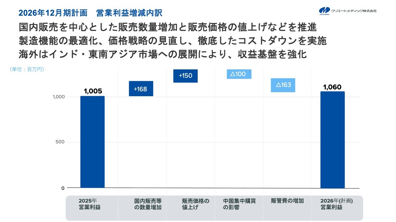 一方で、外的要因としては中国における集中購買の影響が予想され、横浜キャピタルとの事業提携による製造機能の最適化や海外の新市場開拓など、将来の収益基盤強化にかかる投資費用が嵩む予定ですので、来期の営業利益は僅かな伸びとなる見込みです。
