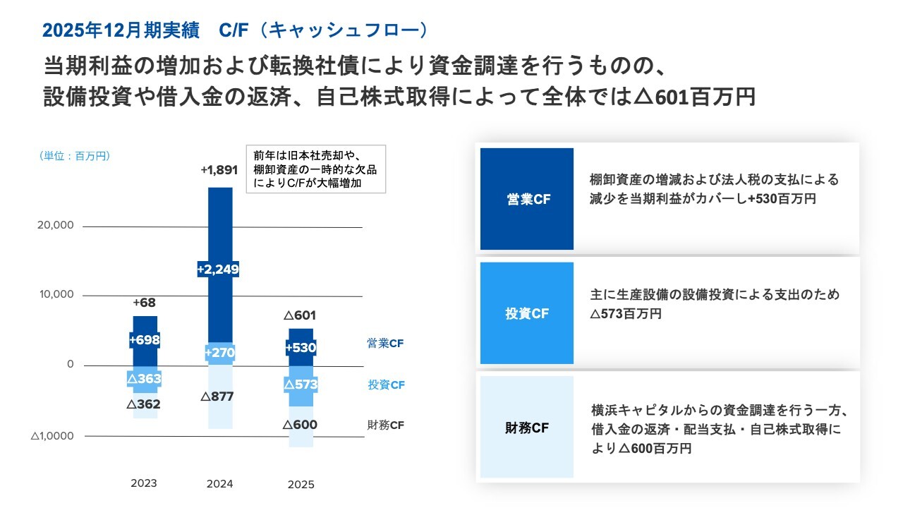 財務キャッシュフローは横浜キャピタルの転換社債により資金調達を行う一方、借入金の返済や配当金の支払い、自己株式取得によりマイナス6億円となりました。