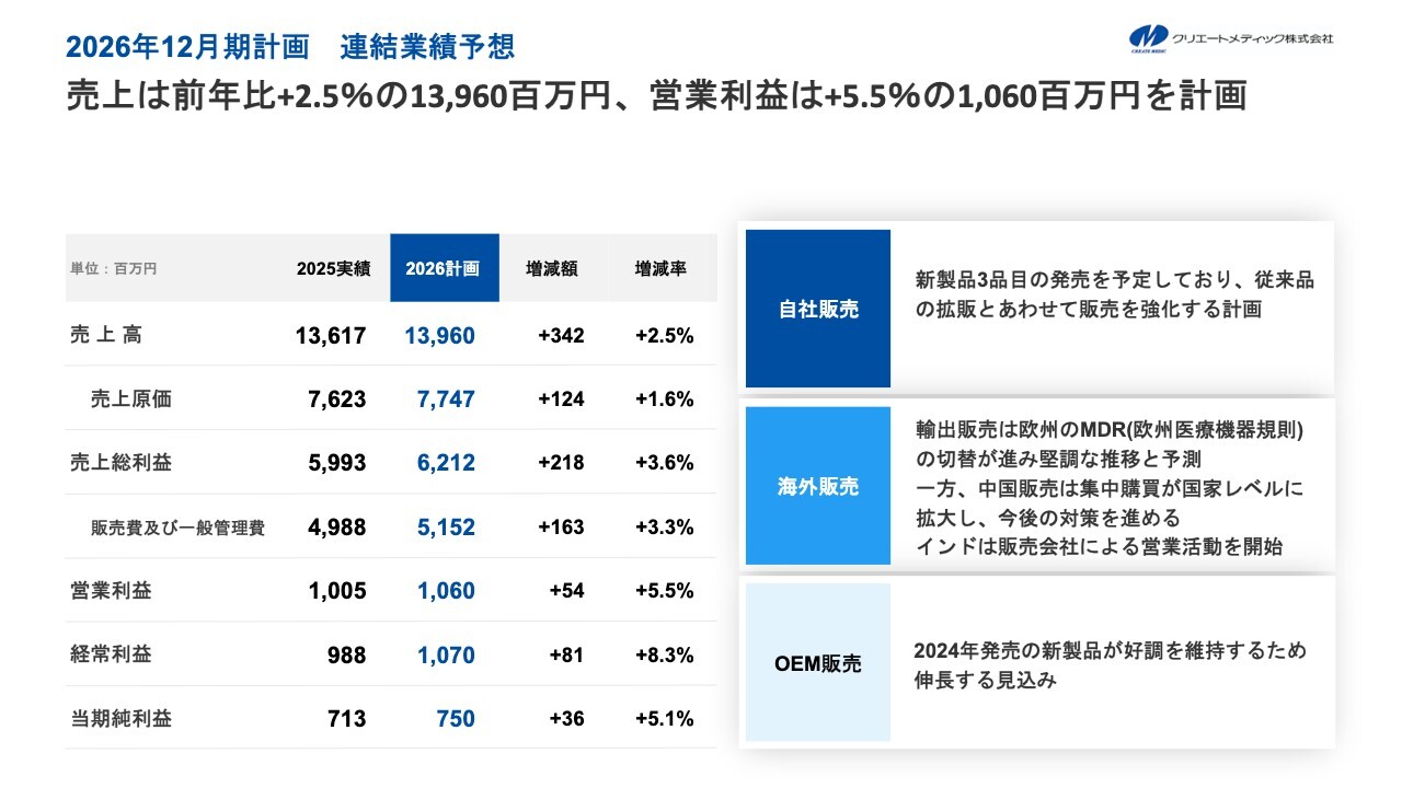 2026年2月13日に発表された、クリエートメディック株式会社2025年12月期決算説明の内容を書き起こしでお伝えします。