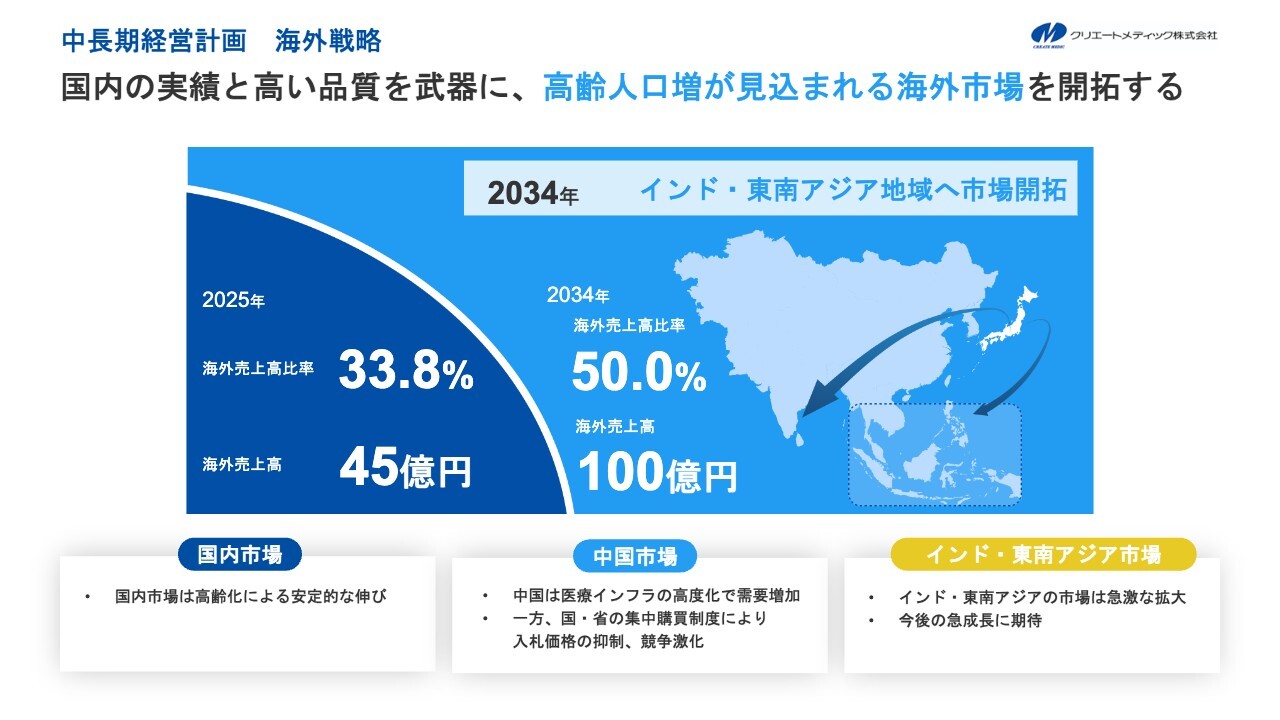 中長期経営計画達成のための最重要施策が、インドおよび東南アジア事業の推進です。特にインド・東南アジアは市場規模が急速に拡大しており、シリコーン製カテーテルの泌尿器・消化器分野の国内シェアの強みを活かし市場を開拓します。具体的な数値目標として、2034年度までに海外売上比率50パーセント、海外売上高100億円の目標を掲げています。
