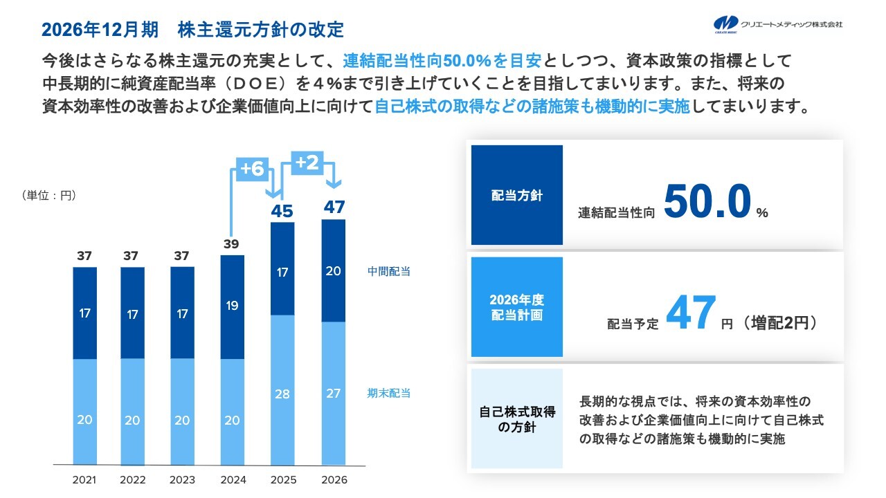 このような株主還元方針に基づき、当期の期末配当金を見直し、年間配当金は前期の39円から45円へ、そして次期、2026年12月期については、さらなる増配となる年間47円(中間配当20円、期末配当27円)を予定しています。