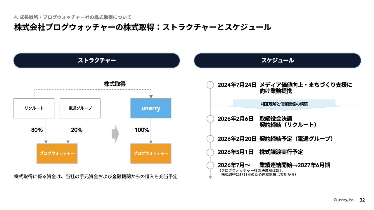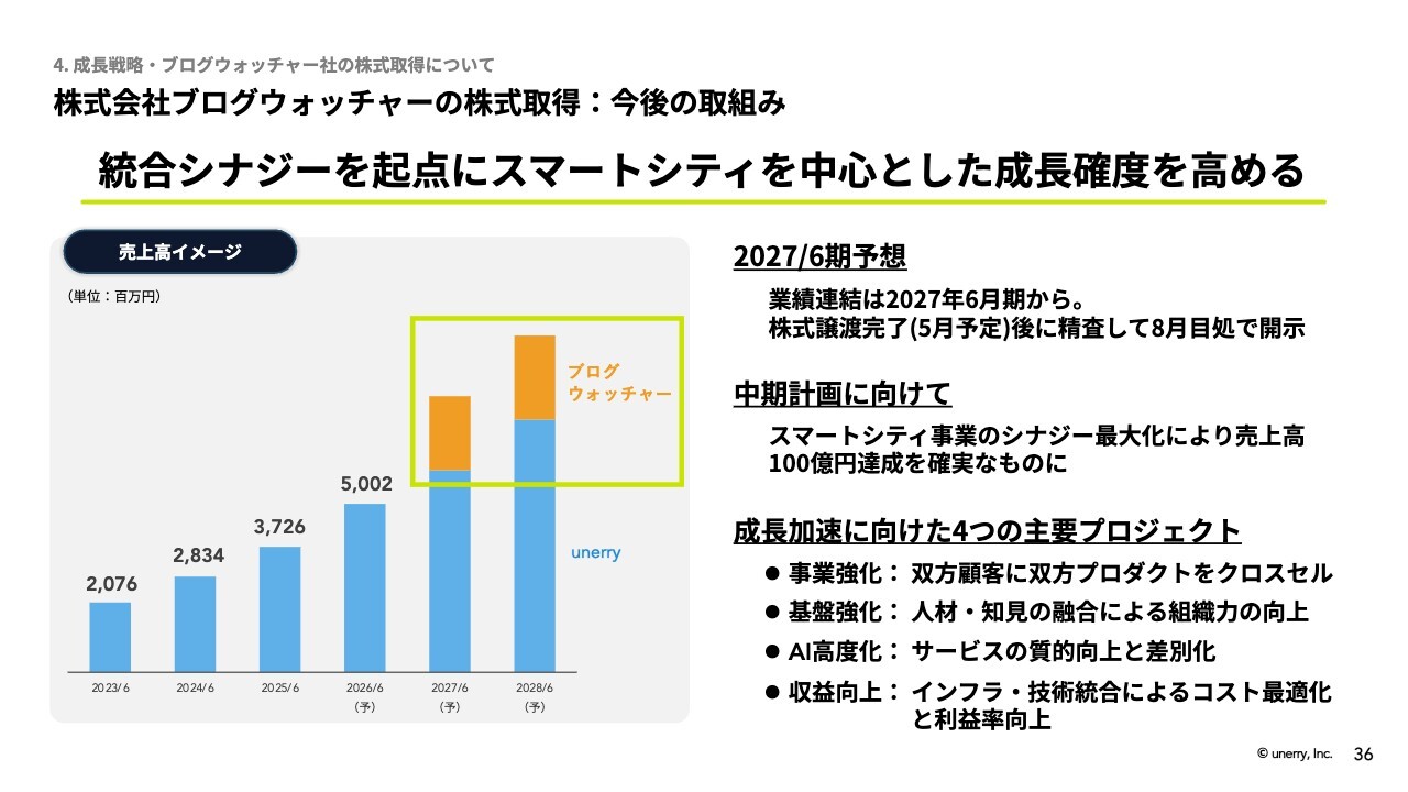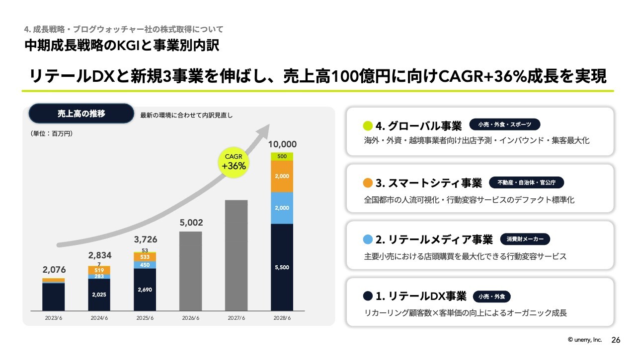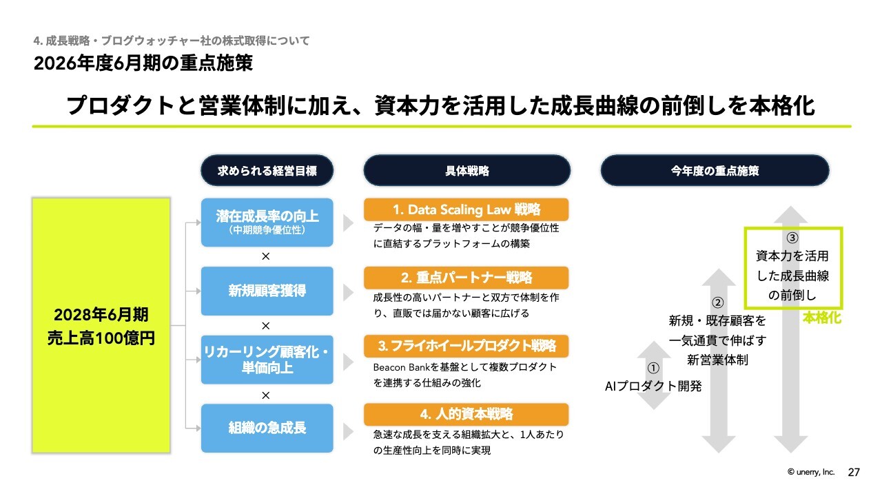 成長戦略については、今回新たにブログウォッチャーの株式を100パーセント取得することで、2028年6月期の売上高100億円という中期計画の達成確度が大きく向上した点がハイライトです。詳細は後ほどご報告します。