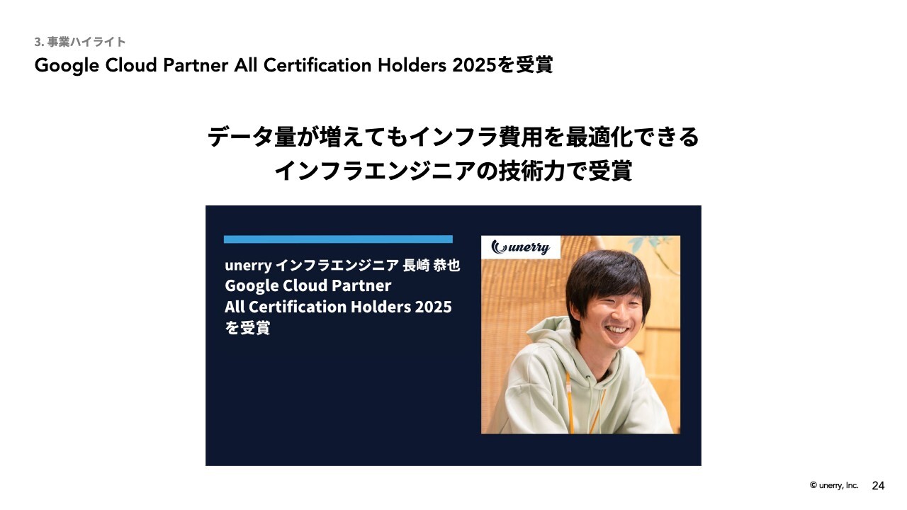 当社のエンジニアである長崎は「Google Cloud」の認定資格のすべてを有していることを表彰され、インフラ費用の最適化やシステム稼働の安定性に貢献しています。以上が業績ハイライトです。