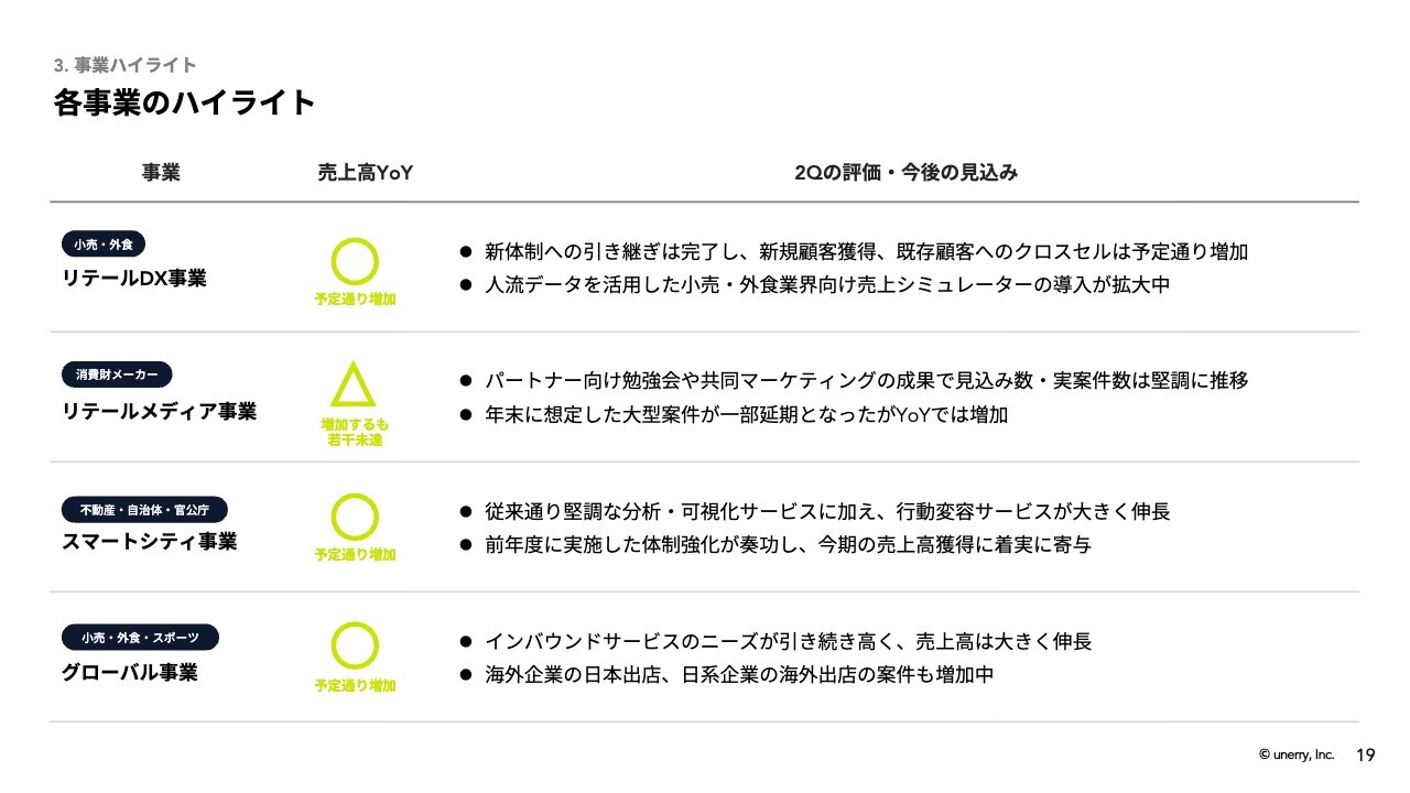 内山:ここからは、事業のハイライトについてご報告します。4つの事業がありますが、○△✕の記号で、昨年度同期の売上高に対する伸び率を表しています。