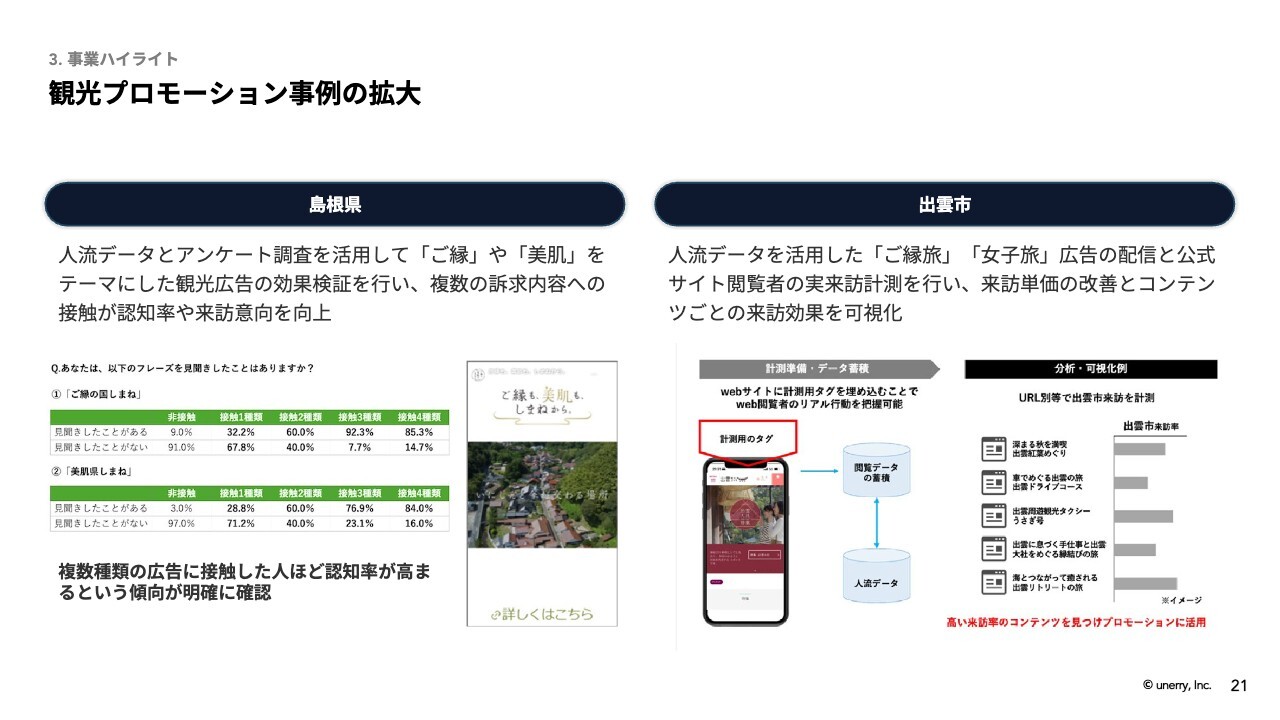 スマートシティ事業においては、観光プロモーションの事例も拡大しています。例えば、島根県では人流データやアンケートデータを活用し、「ご縁」や「美肌」といったさまざまな情報を複数お届けすることで、島根県に行きたいという意欲を高め、実際に訪れたことまで確認できた事例があります。