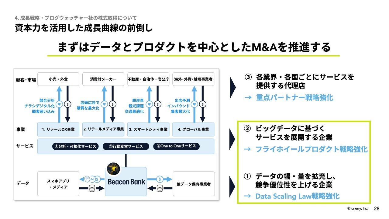 当社のM&A戦略で特に重要なのは、我々のデータの引力をどれだけ活用できるかという点です。今回、ブログウォッチャーとM&Aを実施しましたが、他にも非常に優良なデータホルダーが存在します。