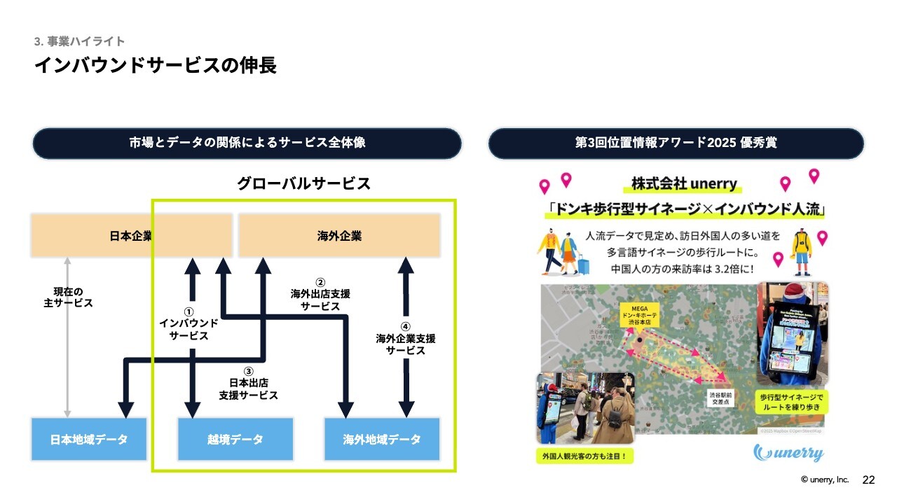 グローバル事業も計画どおり増加しており、特にインバウンドサービスのニーズが極めて高く、売上高を牽引しています。さらに、海外企業が日本に進出する案件や、日本企業が海外展開する案件も増加しています。