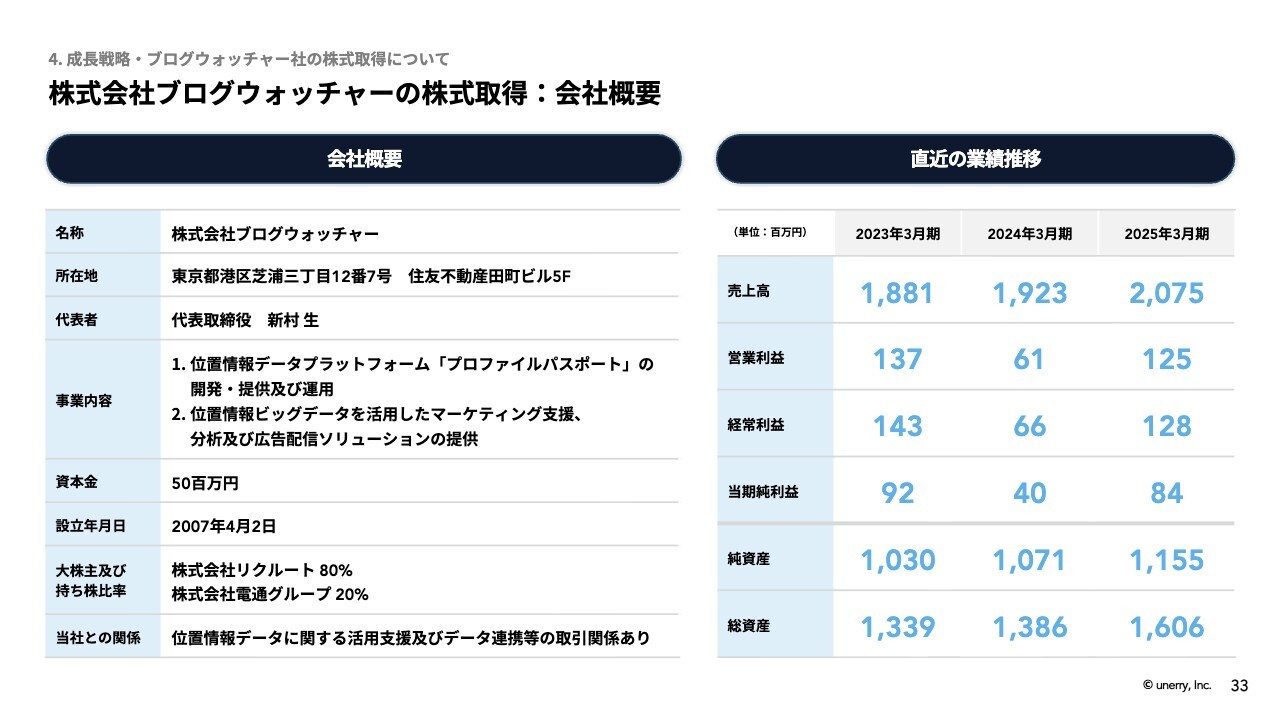 特に今回の重要なテーマとして、成長戦略および先週発表したブログウォッチャーの株式取得についてご報告します。