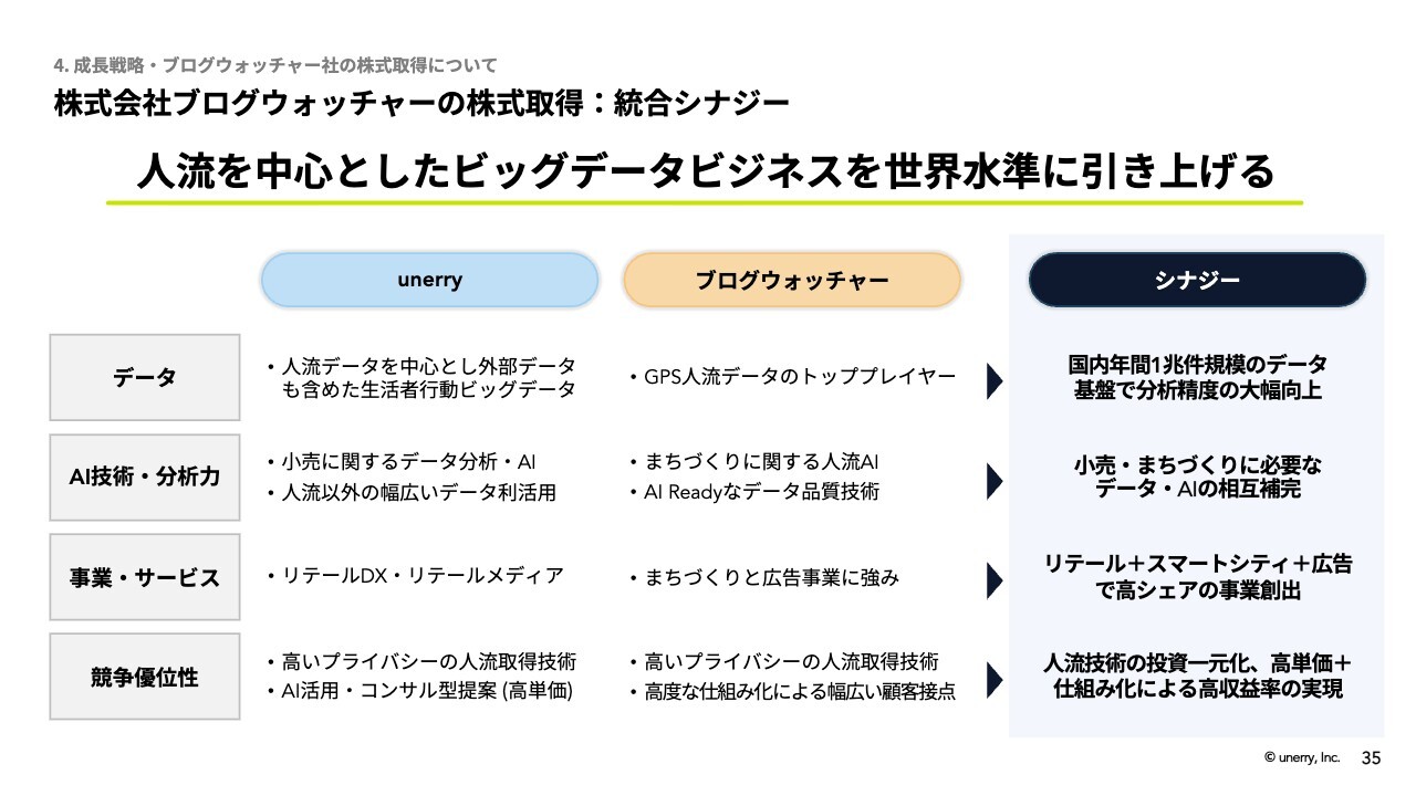 また、unerryとブログウォッチャーのデータを掛け合わせることで、年間約1兆件規模のデータを扱う想定です。まさに、AI Readyな事業基盤の構築を目指すということです。