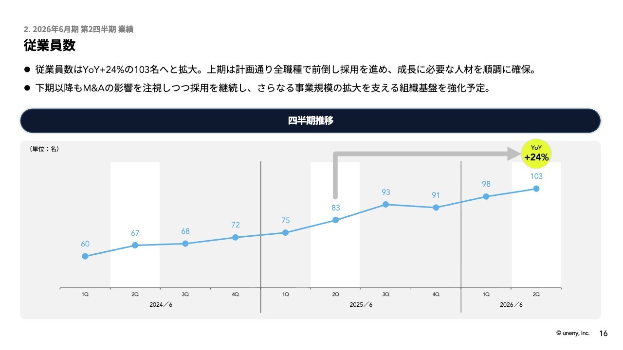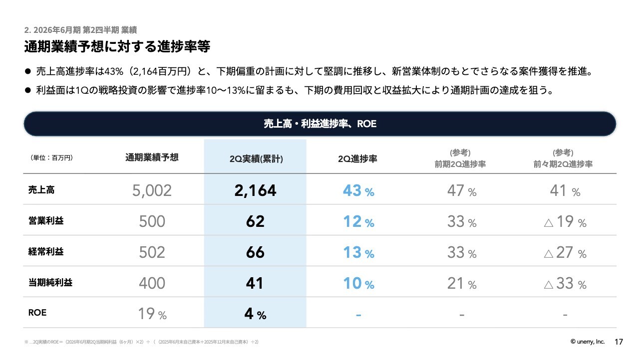 内山英俊氏(以下、内山):株式会社unerry代表取締役社長執行役員CEOの内山です。今回の決算について、2026年6月期第2四半期決算説明会を開催します。