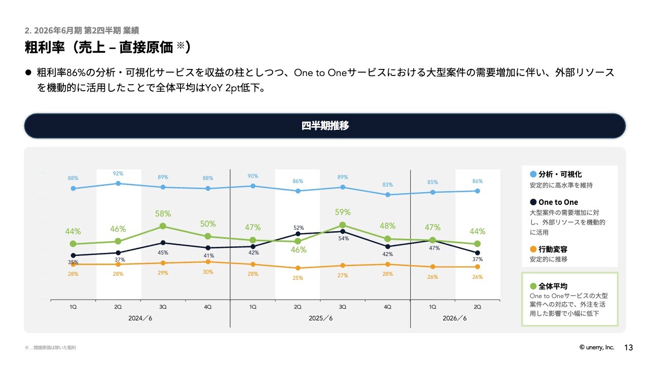続いて、粗利率です。分析・可視化サービスの粗利率は86パーセントと高い水準で安定的に推移しています。One to Oneサービスは、大型案件に伴い外部リソースを使用した影響で、37パーセントと若干低下しています。行動変容サービスは、安定的に26パーセントで推移しています。全体では44パーセントという結果となりました。