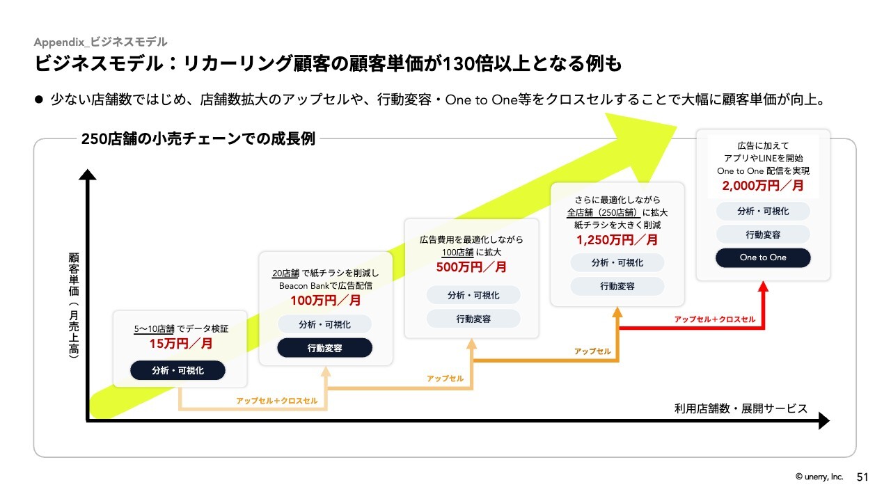 特に当社のビジネスモデルでは、例えば「ショッパーみえ〜る」を基軸とし、「分析・可視化」を通じて比較的安価な単価で市場に参入しています。さらに、「行動変容」をクロスセルし、さらに「One to One」をクロスセルすることによって、売上高が100倍以上に拡大することが、当社における顧客成長となっています。