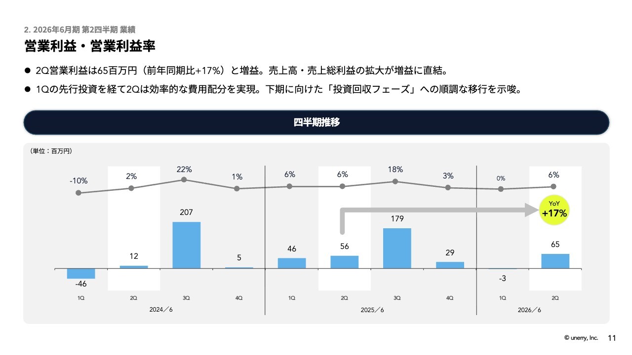 営業利益は6,500万円、営業利益率は6パーセントとなりました。第1四半期の戦略的な先行投資を経て、第2四半期からは投資回収フェーズへ順調に移行しています。