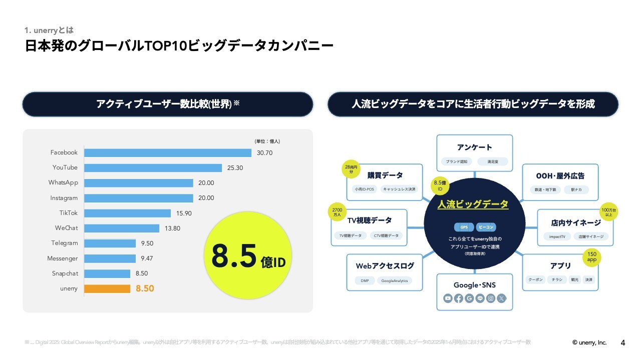 unerryは、日本発のグローバルTOP10ビッグデータ企業にまで成長し、現在8.5億IDものスマートフォンの位置情報を集積しています。このデータは、当社では「人流データ」と呼んでいます。アクティブユーザー数で見ると、グローバルでTOP10に到達する企業となりました。