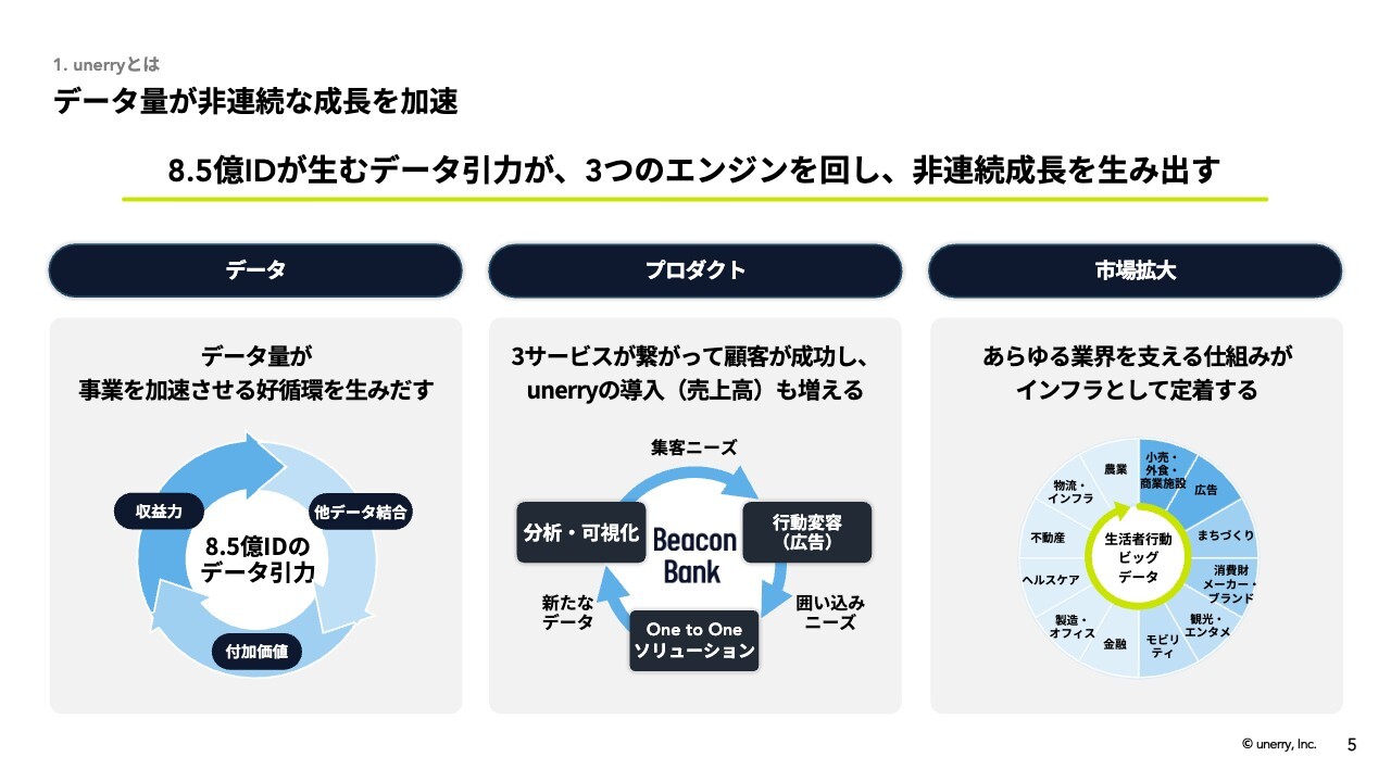 そのため、一定以上の閾値を超えて初めてデータが意味を持つのです。unerryは、その閾値を超えたまれな企業であると自負していますが、それでもさらに多くのデータを増やしていきたいと考えています。