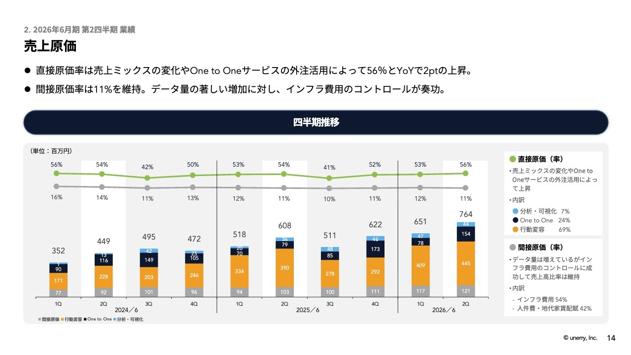 一方、間接原価は、通常であればデータ量の大幅な増加に伴いインフラ費用が増加するところですが、このインフラ費用を適切にコントロールした結果、安定的に抑えることができています。