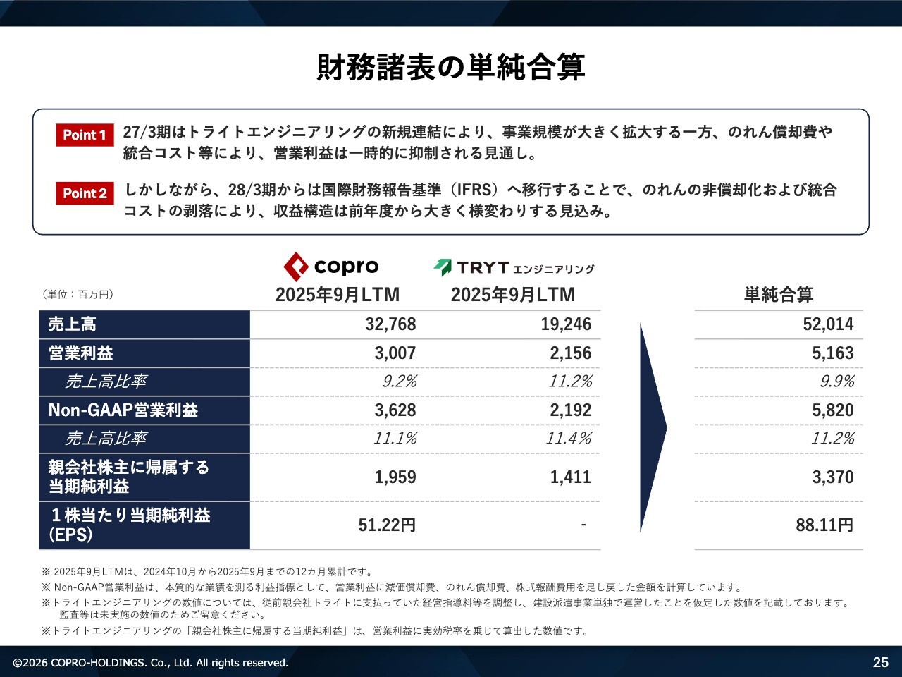 スライド下段には、2025年9月期を基準として、当社グループのコプロと、グループイン予定のトライトエンジニアリングの財務諸表を掲載しています。この基準を9月とした理由は、9月時点でデューデリジェンスが開始されており、12月決算の数値がまだ出ていなかったためです。そのため、9月を基準として単純合算した数値がスライド右側の数字になっています。