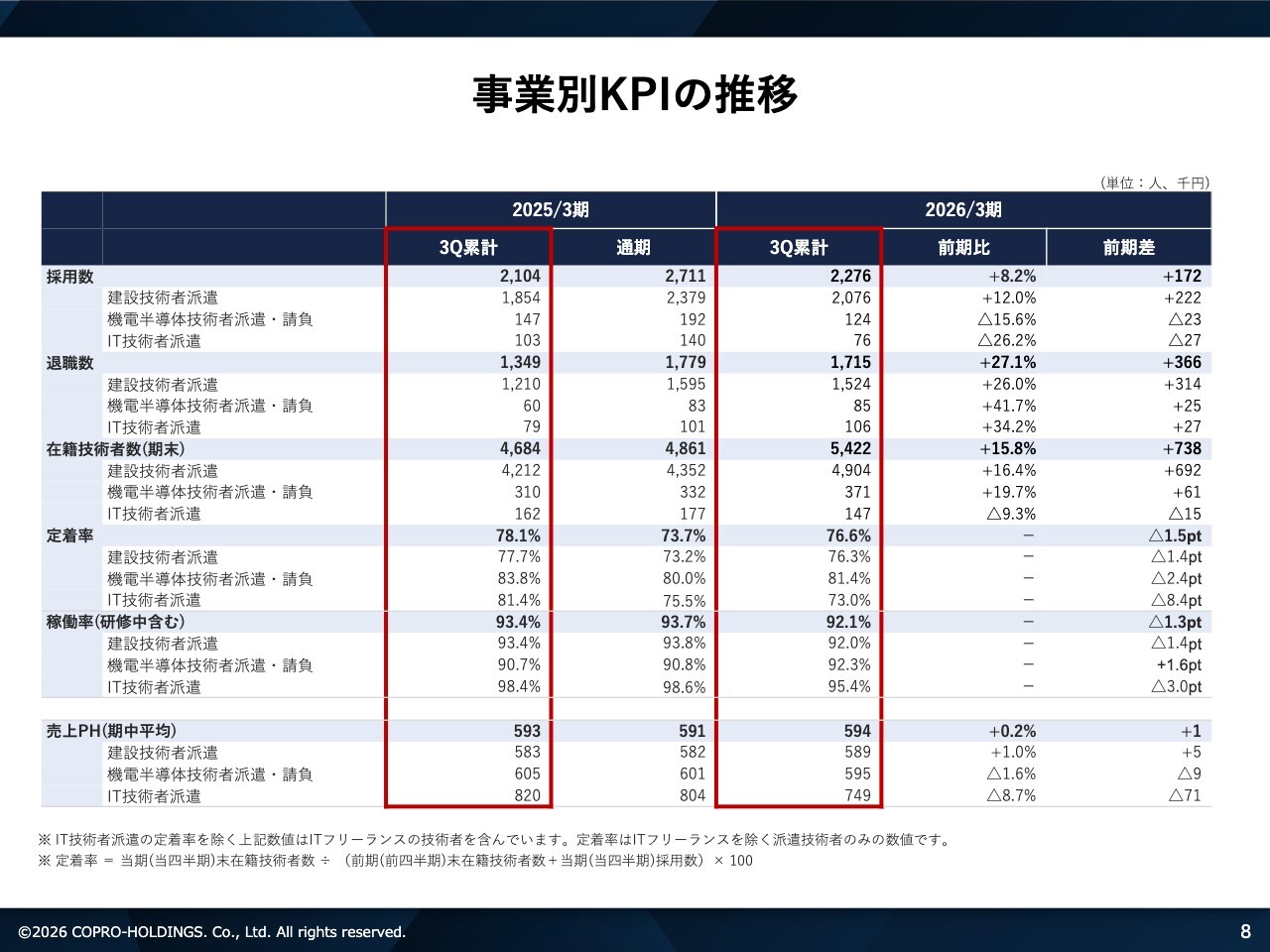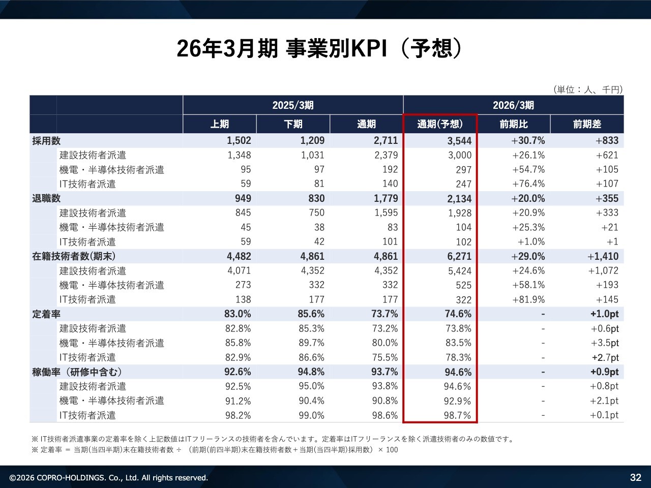 2026年3月期、今期の事業別KPI予想です。採用数、退職数、在籍技術者数(期末)、定着率、稼働率(研修含む)について、ぜひご覧いただければと思います。