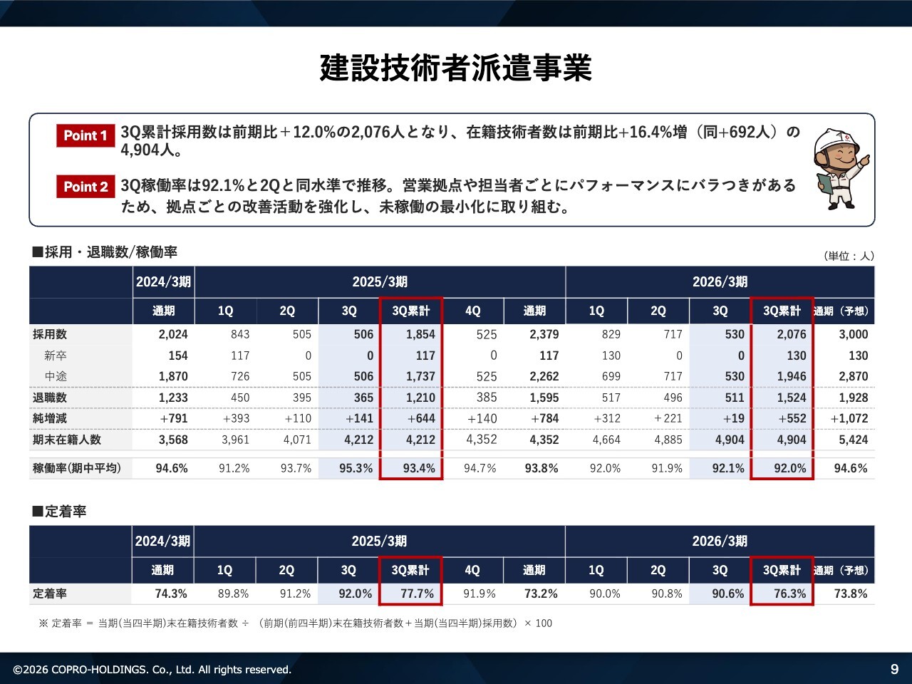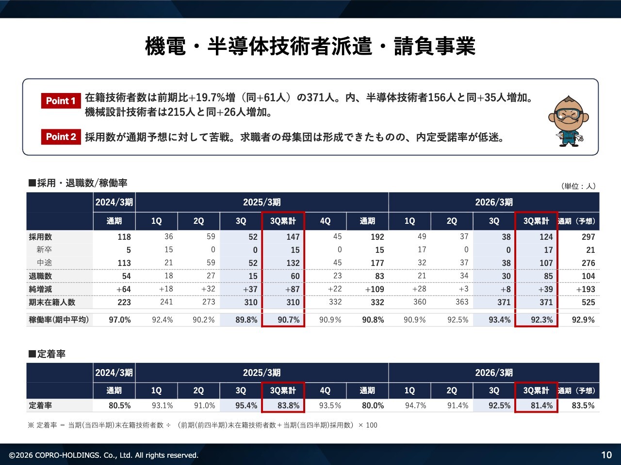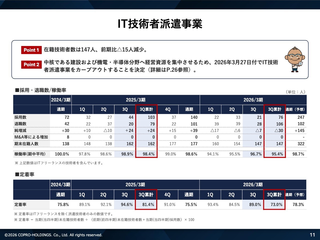 要因には、第3四半期の総括として、採用と受注案件のマッチング精度がやや低かったことが挙げられます。そのため定着率が下がり、稼働率も若干低下した状況です。
