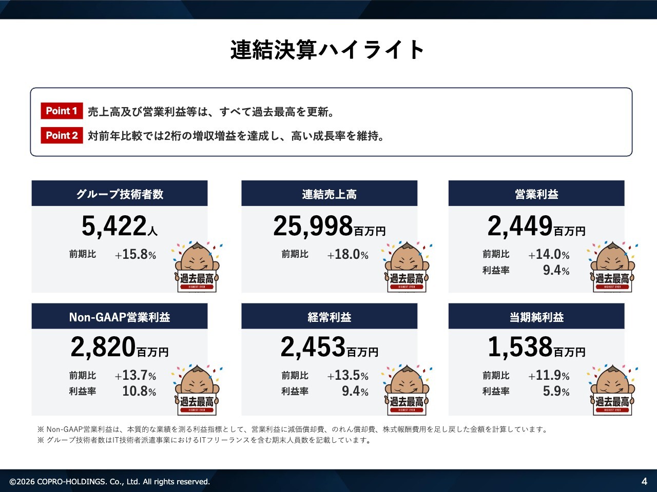 Non-GAAPの営業利益は28億2,000万円で、前期比プラス13.7パーセント、Non-GAAPの営業利益率は10.8パーセントとなっています。経常利益は24億5,300万円で、前期比プラス13.5パーセント、経常利益率は9.4パーセントです。