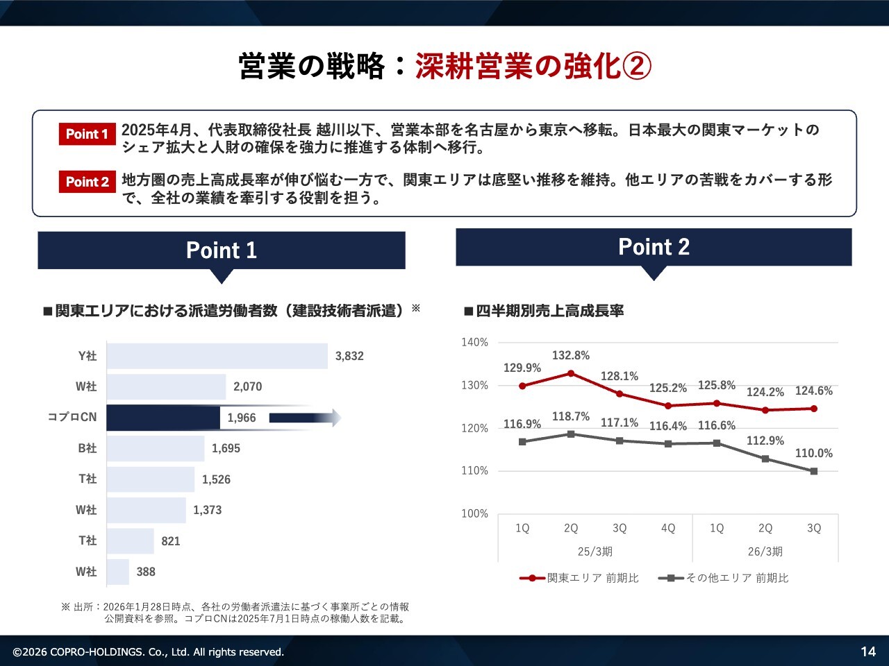 1点目のポイントは、2025年4月に事業子会社であるコプロコンストラクションの社長を務める越川を含め、営業本部が創業地である名古屋から東京へ移転しました。建設投資額が圧倒的に多い関東エリア、特に東京でのシェアを獲得することが非常に重要であるため、社長以下の異動を実施しています。社長が関東エリアで直接陣頭指揮を執ることで、このマーケットをしっかりと攻略していく方針です。