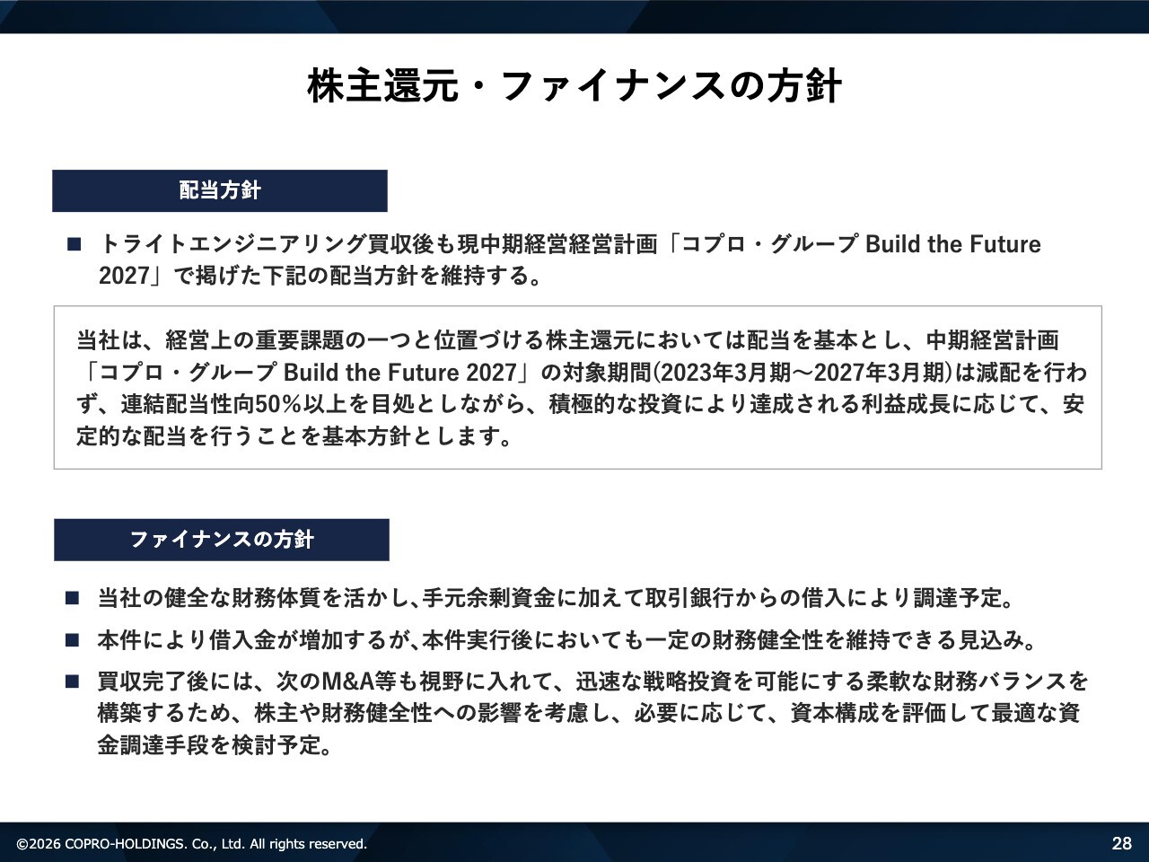 今回のトライトエンジニアリング買収後の株主還元に対する考え方、およびファイナンスに対する方針についてご説明します。まず配当方針についてです。トライトエンジニアリング買収後も、コプロ・グループの現中期経営計画「コプロ・グループ Build the Future 2027」で掲げた配当方針を維持していきます。