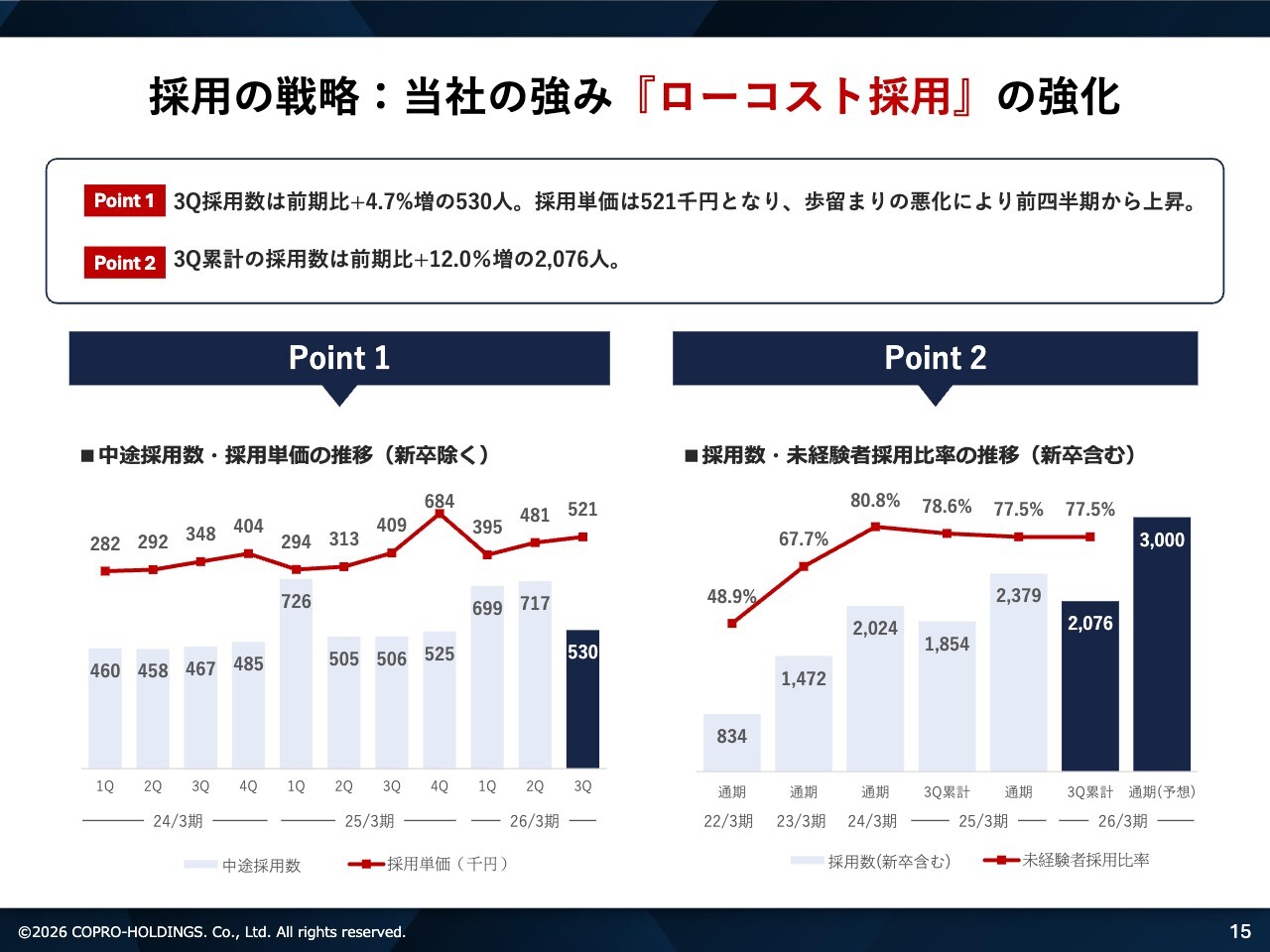 スライド右側、ポイント2の図は、累計の採用数と未経験者採用比率を示しています。第3四半期の累計採用数は2,076人、未経験者採用比率は77.5パーセントとなっています。