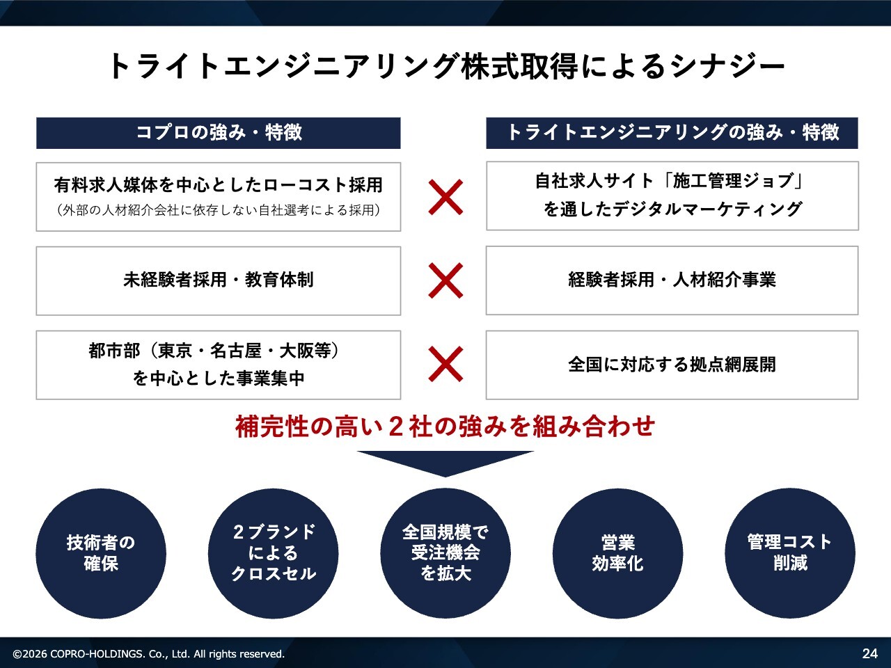 今後は、コプロコンストラクションとトライトエンジニアリングのシナジーを十分に発揮し、オーガニックな成長に加え、さらなる業界再編の一手を進めていきたいと考えています。