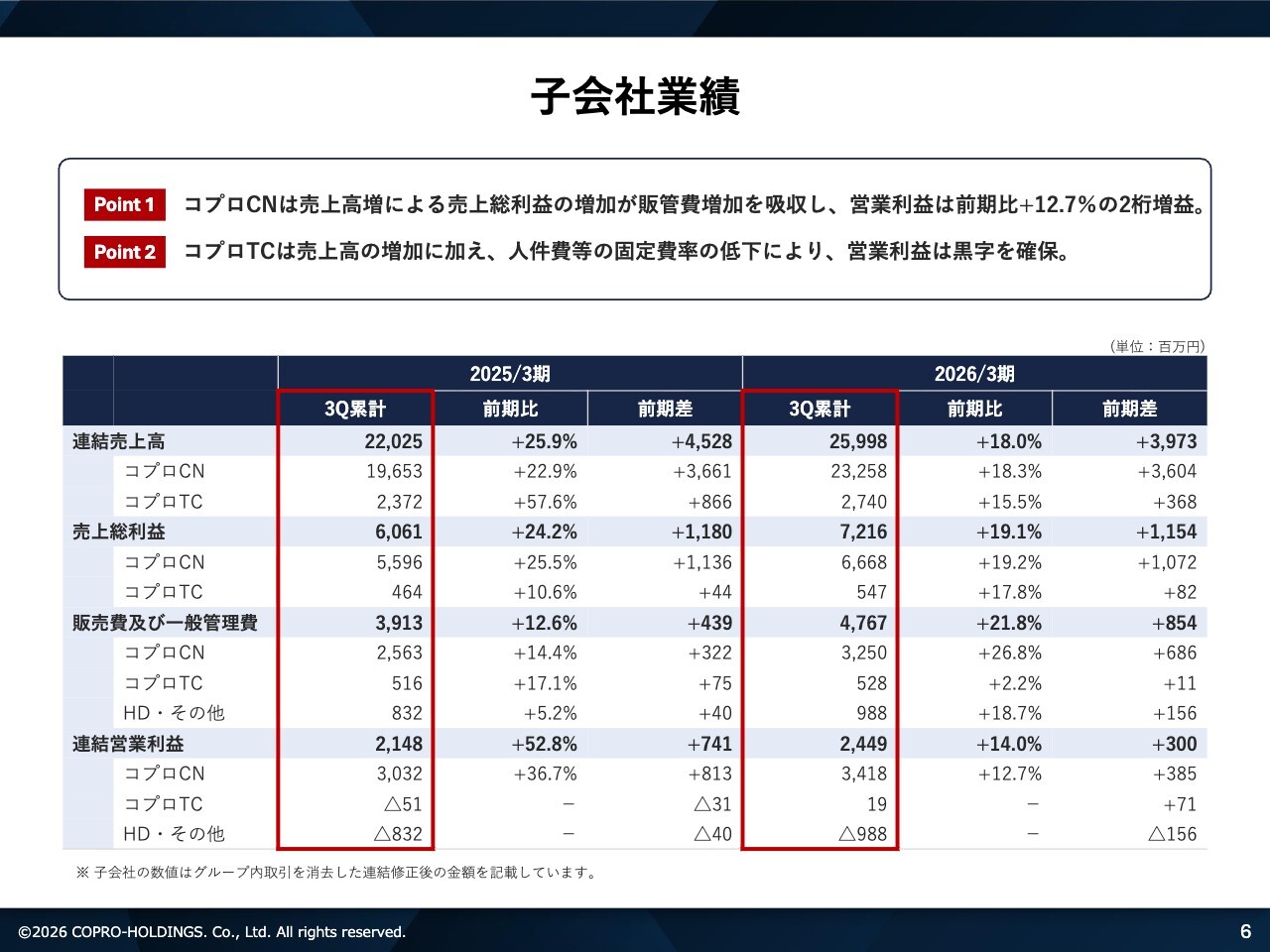2点目のポイントは、コプロテクノロジーです。機電・半導体、ITの領域において、売上高の増加に加え、人件費など固定費の低下により営業利益が黒字に転換しました。