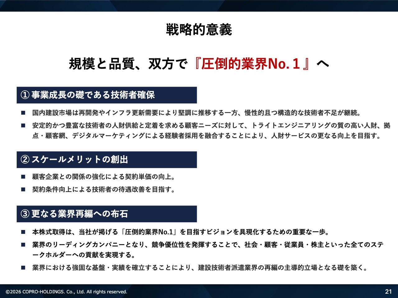 3つ目は、さらなる業界再編への布石です。今回の株式取得は、当社が掲げる「圧倒的業界No.1」を目指すビジョンを具現化するための重要な一歩です。業界のリーディングカンパニーとなり、競争優位性を発揮することで、社会、顧客、従業員、株主といったすべてのステークホルダーに貢献を実現していきます。