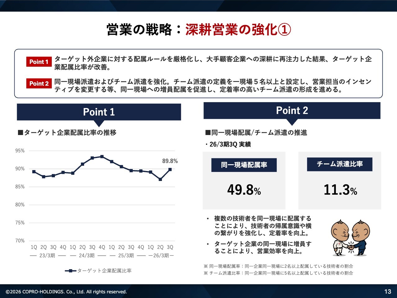 現在、営業部門が進めている方針に従い、ルールやエビデンスに基づいて定着率を高める取り組みを徹底するためには、同一現場配属率をさらに高めることが必要です。そして、チーム派遣比率を引き上げることが、当社の重要な戦略の1つとなっています。引き続き、これらの比率を高める努力を続けていきます。