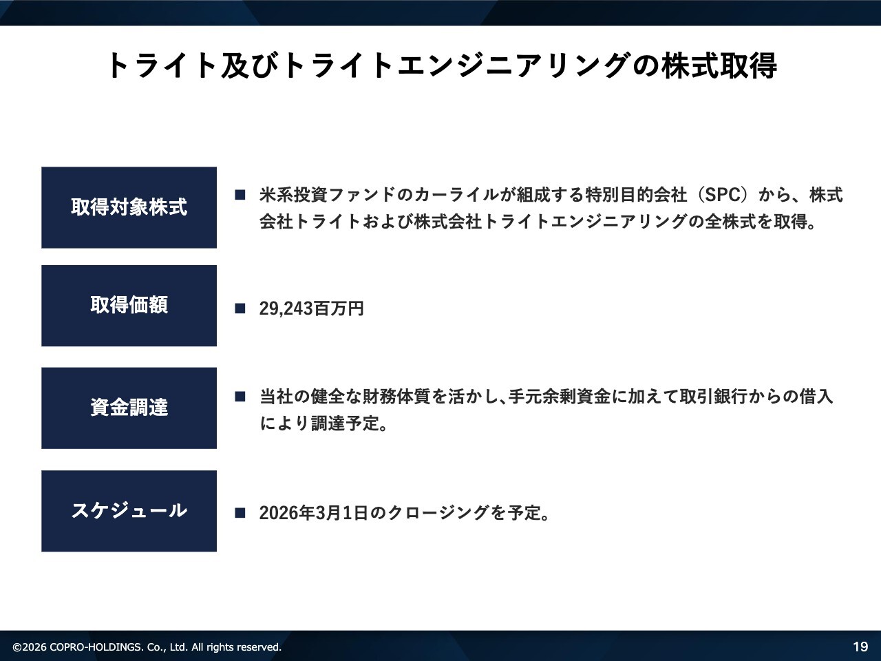 それでは、少し話題を変えます。当社は今年創業20年を迎え、上場から7年となりますが、この中で大きな経営判断を行いました。トライトおよびトライトエンジニアリングの株式取得に関してご説明します。