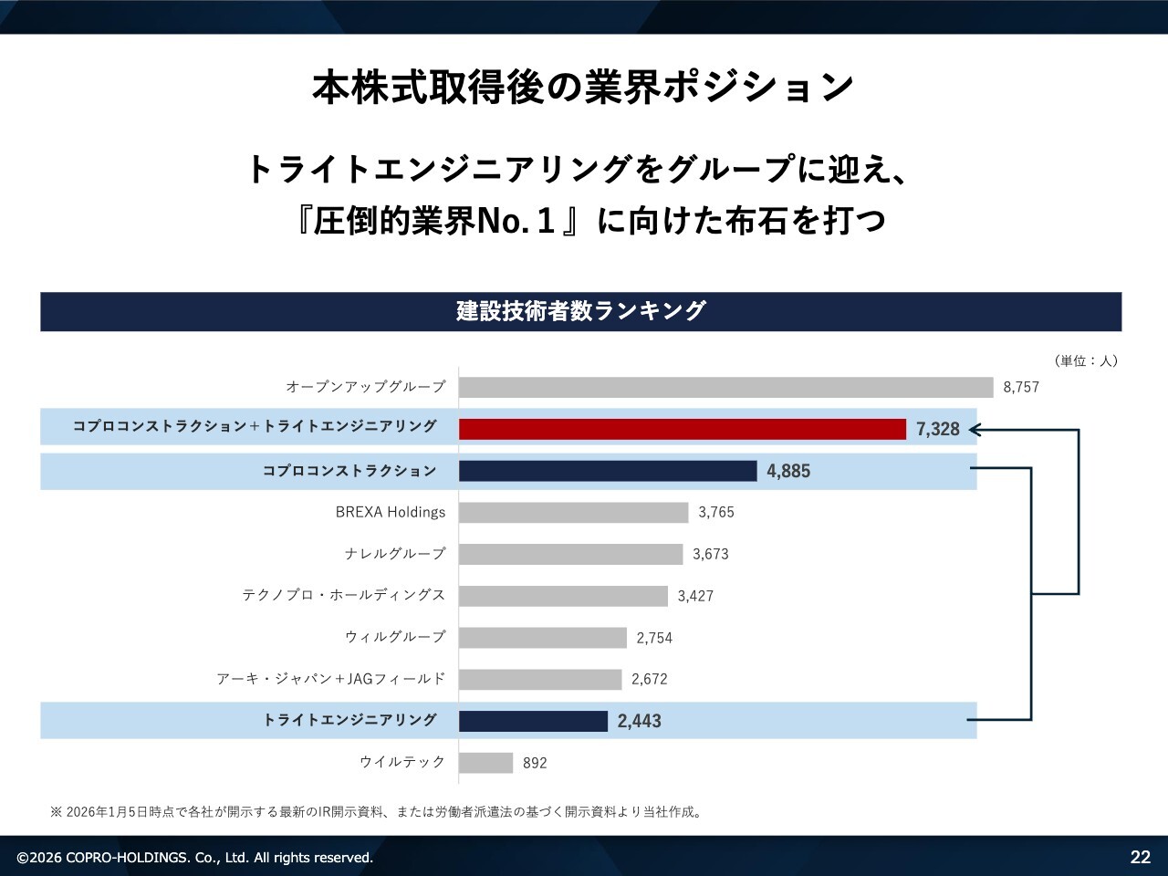 本株式取得後における業界での当社のポジションについて、グラフを用いてご説明します。まず、トライトエンジニアリングをコプロ・グループに迎え入れることで、「圧倒的業界No.1」に向けた布石を打つこととなります。