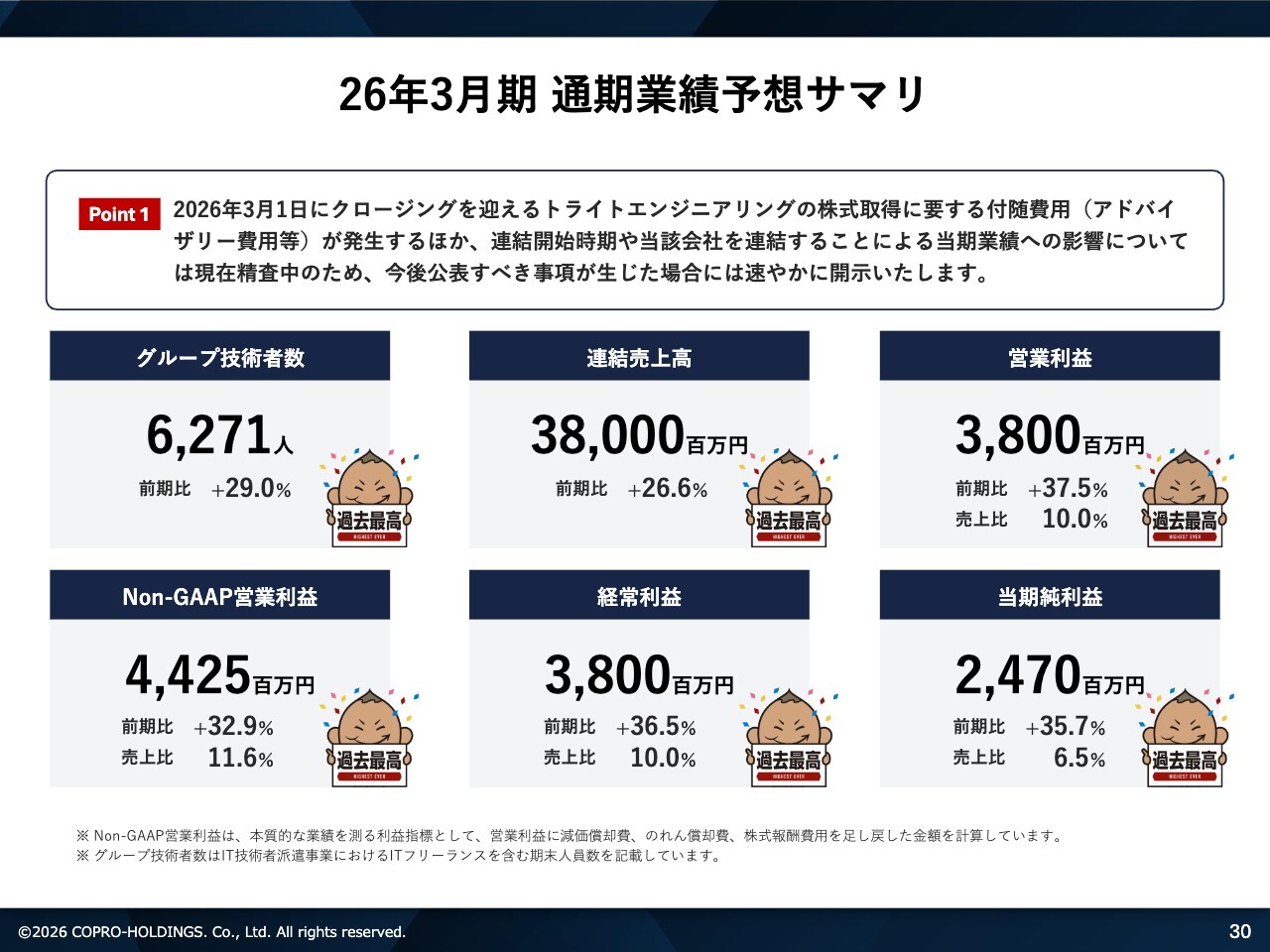 Non-GAAP営業利益は前期比プラス32.9パーセントの44億2,500万円、Non-GAAP営業利益率は11.6パーセント、経常利益は前期比プラス36.5パーセントの38億円、経常利益率は10パーセント、当期純利益は前期比プラス35.7パーセントの24億7,000万円、当期純利益率は6.5パーセントの予定です。