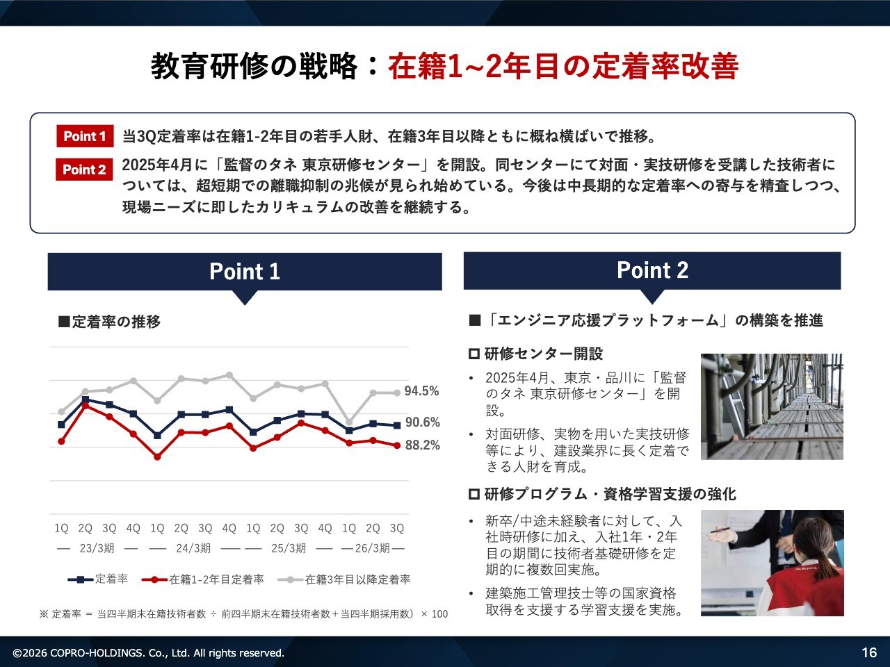 東京・品川エリアには、2025年4月に研修センターを開設しました。この研修センターを通じて、若手社員の研修を行い、在籍1年目、2年目の定着率を高めることが目的です。そして、単価上昇が見込まれる在籍3年目以降を目指していくことが、非常に重要なポイントです。そのため、しっかりと対応を進めていきます。