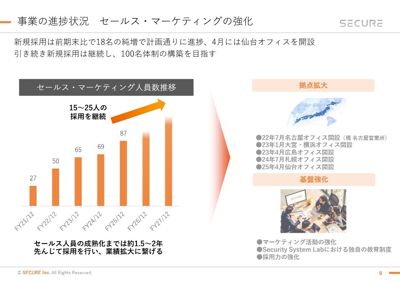 事業の進捗状況についてご説明します。セールス・マーケティングの強化に関しては、新規採用が計画どおり順調に進み、前期末比で18名の純増となりました。新規採用には今後も引き続き注力し、短期的には100名体制の構築を目指し、中長期的には営業体制を強化することで、さらなる業績拡大を実現していきます。
